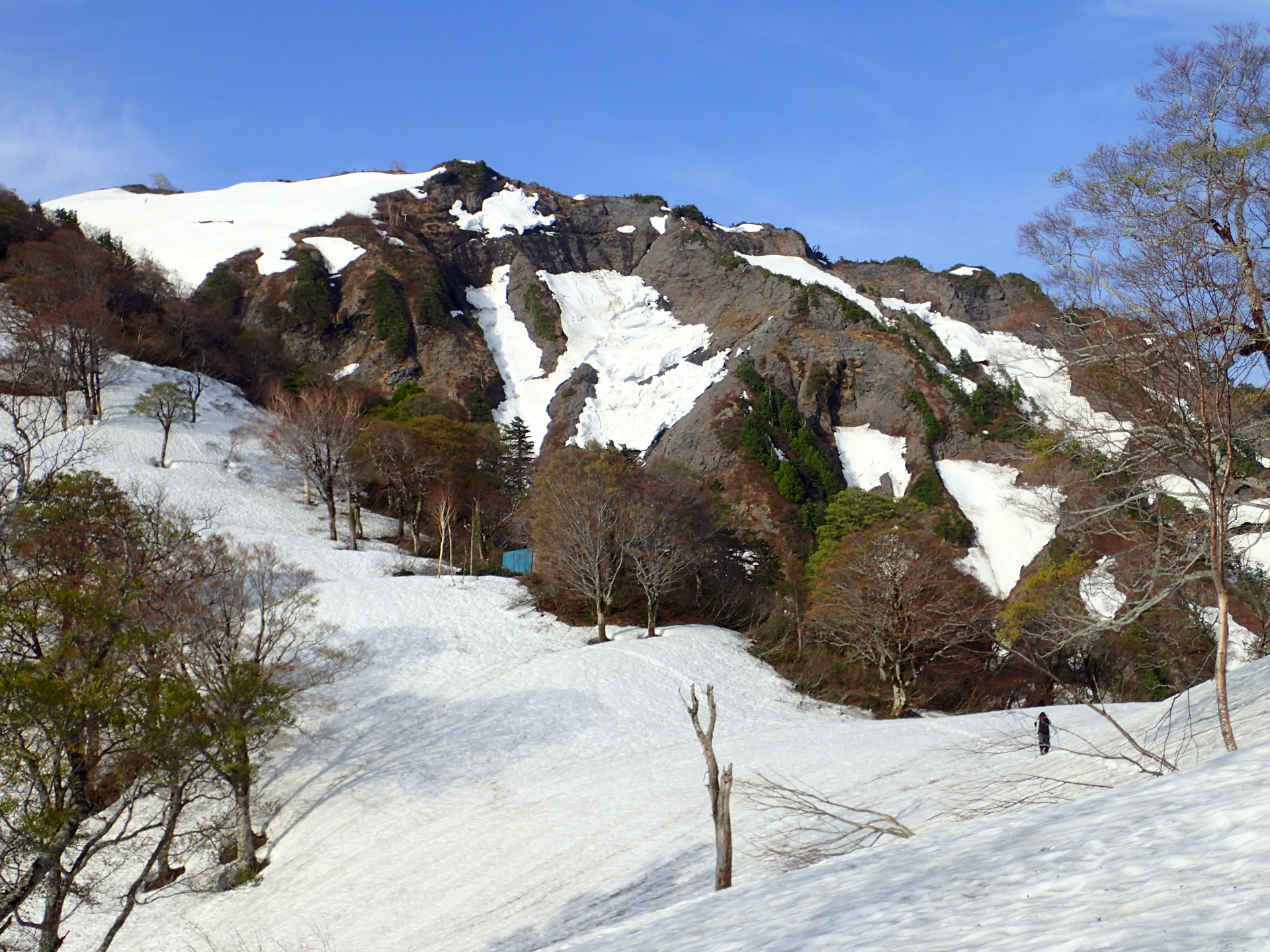 少し戻って大幽朝日岳を目指す。鋸刃は名前からイメージするよりは困難ではない。主に尾根東側をトラバース気味に進む。雪面とガレをうまくつないで登る。徐々に雪がなくなり藪尾根となると急激に
