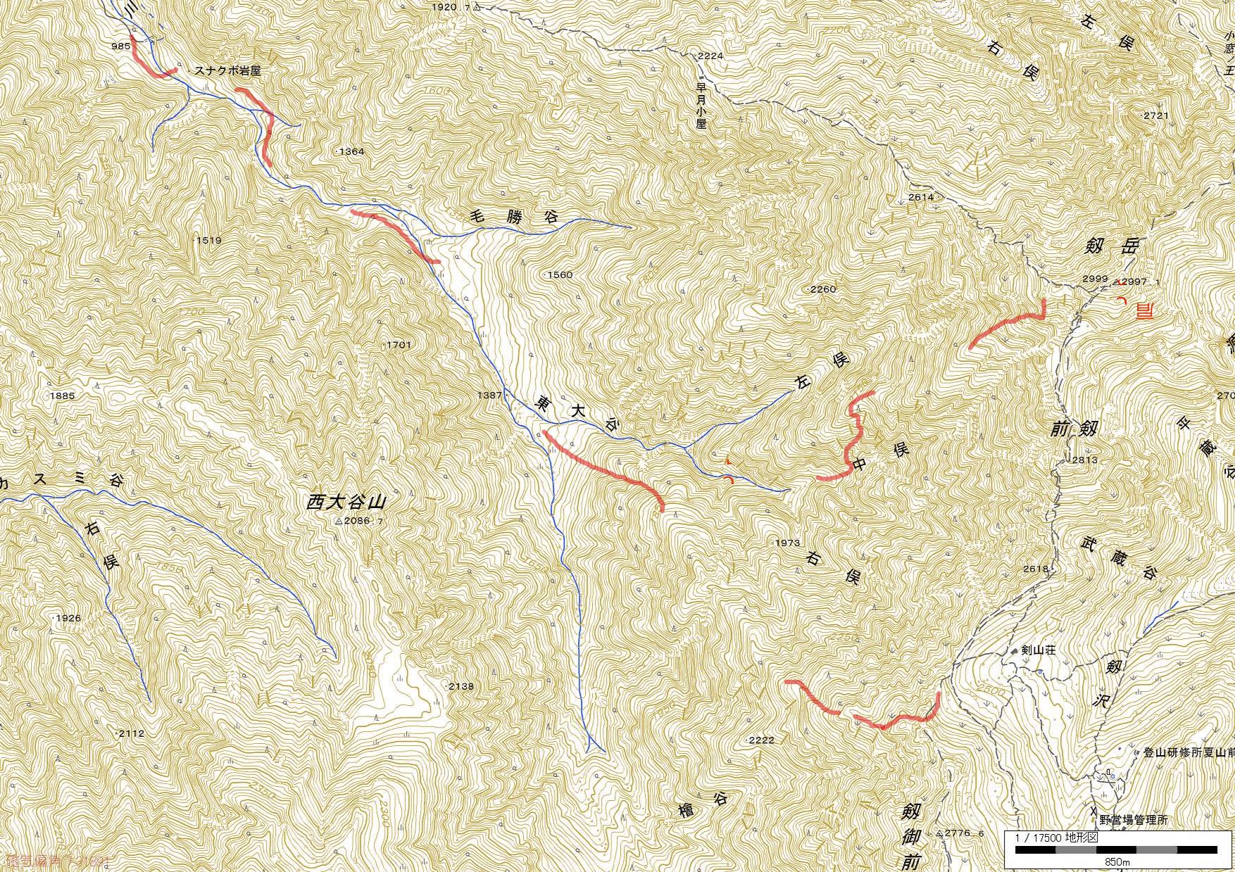1040馬場島-1140スナクボ岩屋-1300毛勝谷出合-1410東大谷出合-1515中俣1735mC1