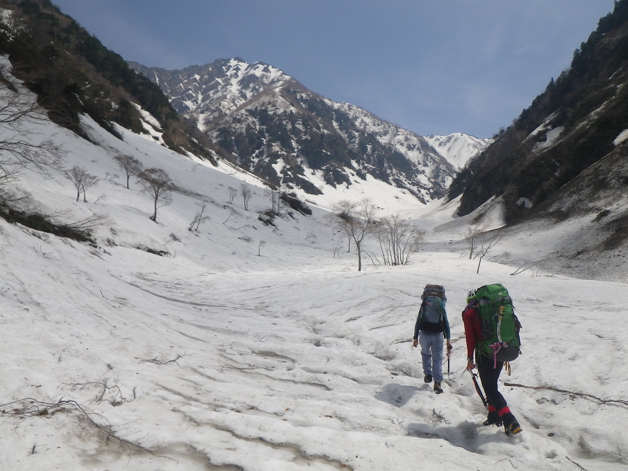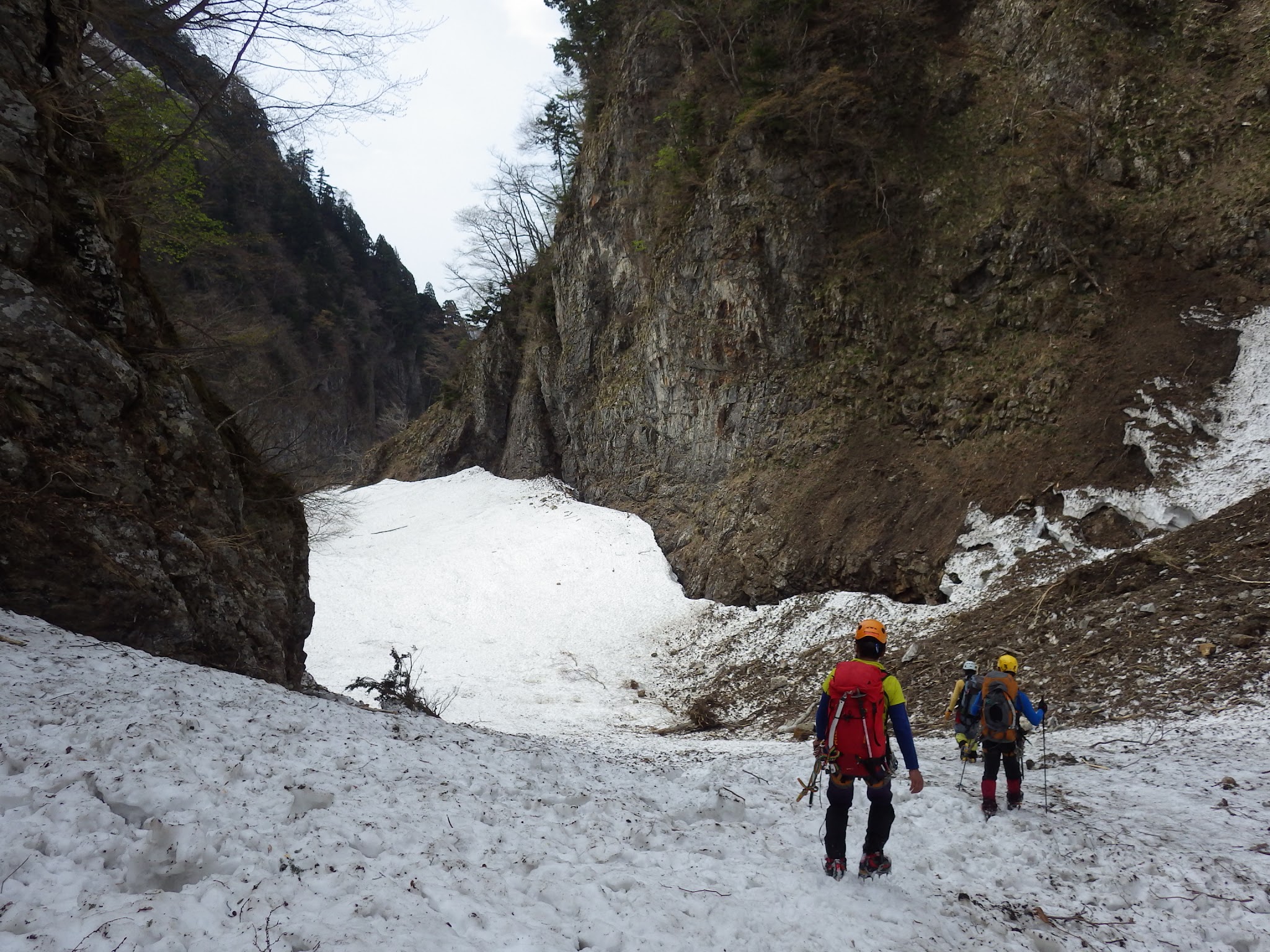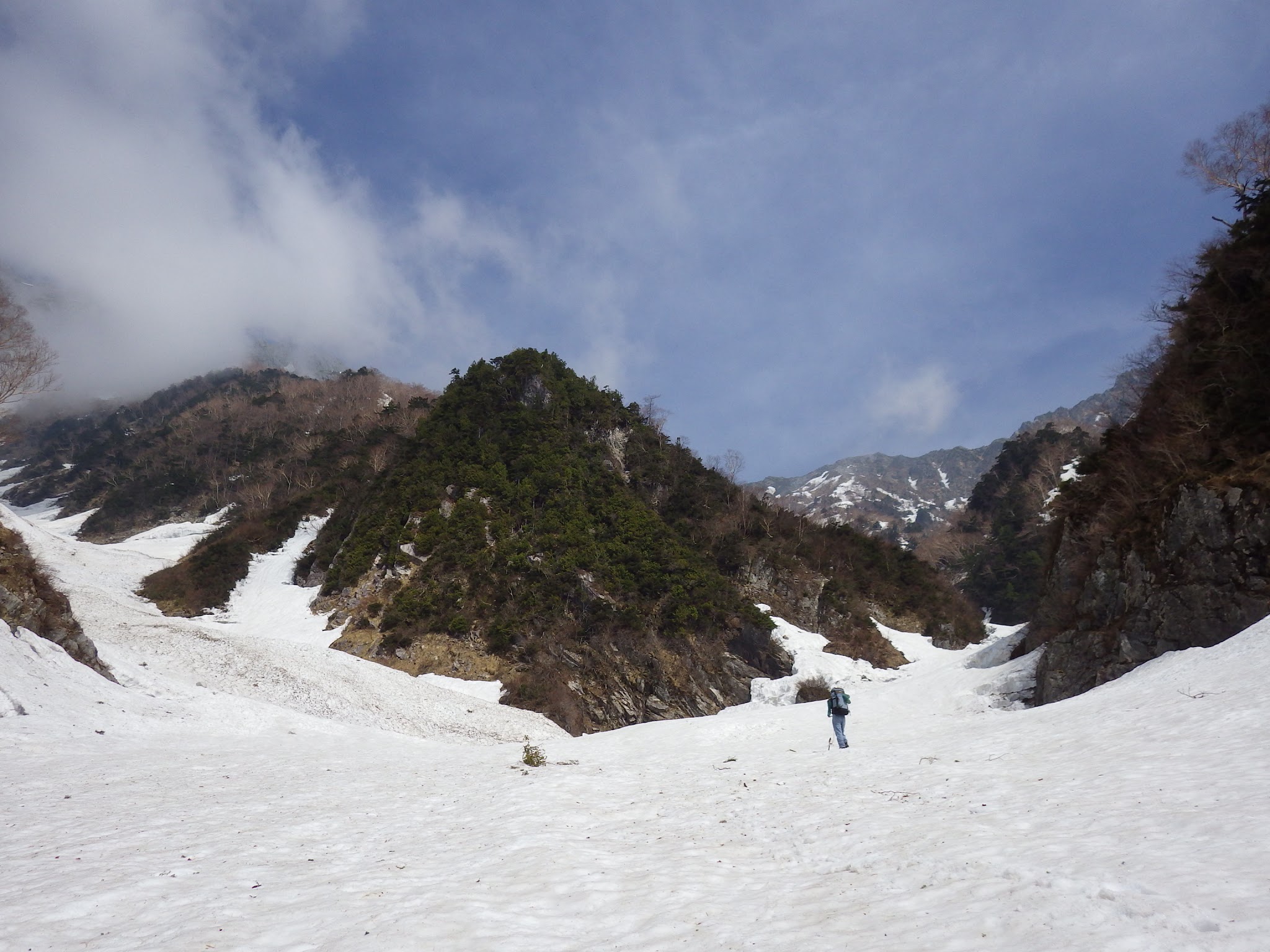 融雪の速さが異常との情報を得ていたので、渡渉に備えてアクステを用意していたが結局スノーブリッジをつなげることができた。スナクボ岩屋付近はゴルジュの様相だが、池ノ谷ゴルジュに比べると広く威圧感はない。ほどなく沢が開けると毛勝谷を合わせ、日本離れした広い東大谷出合となる。