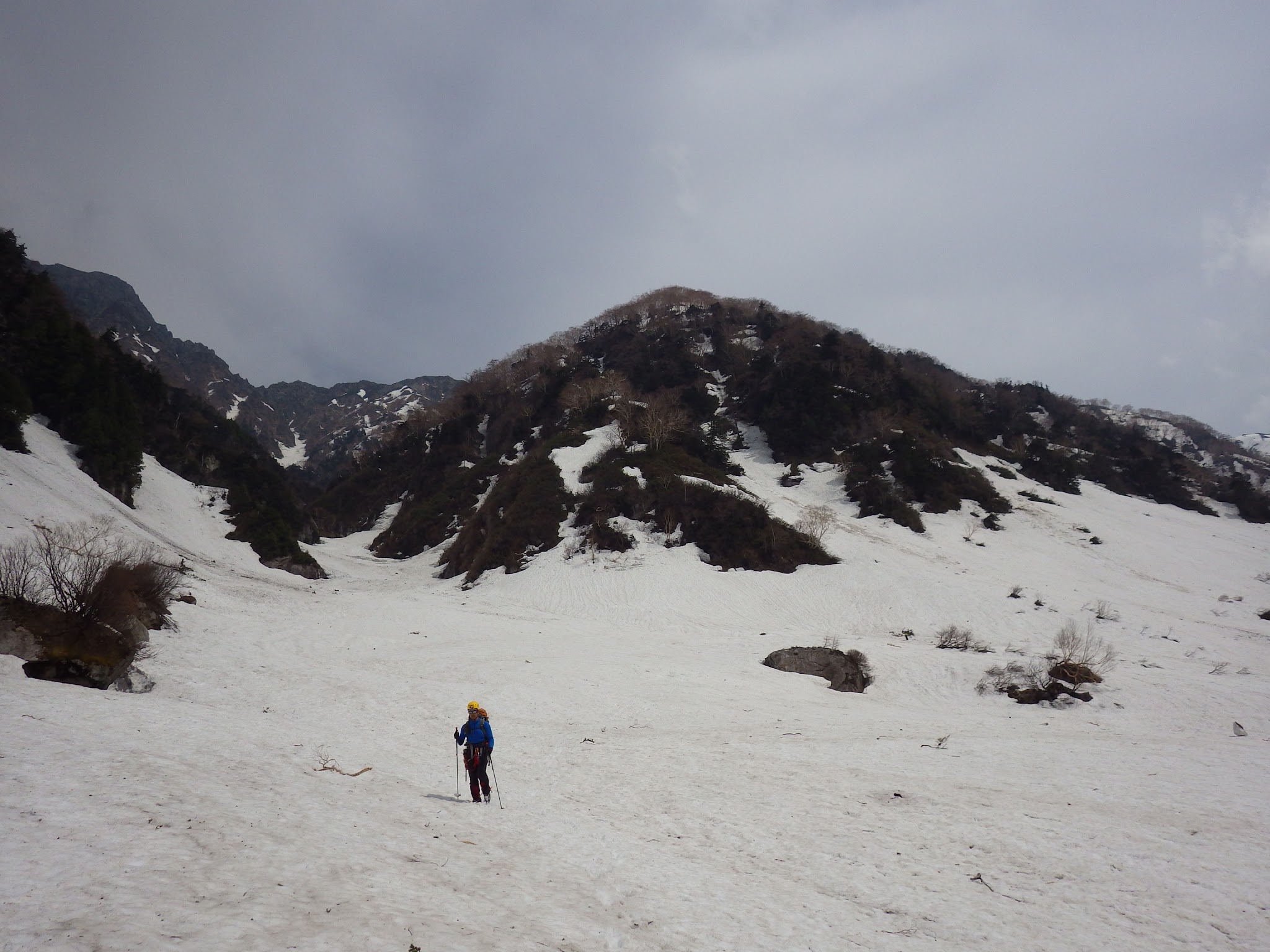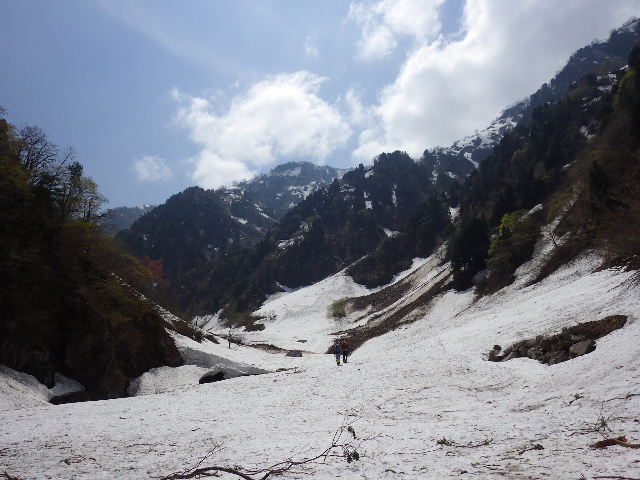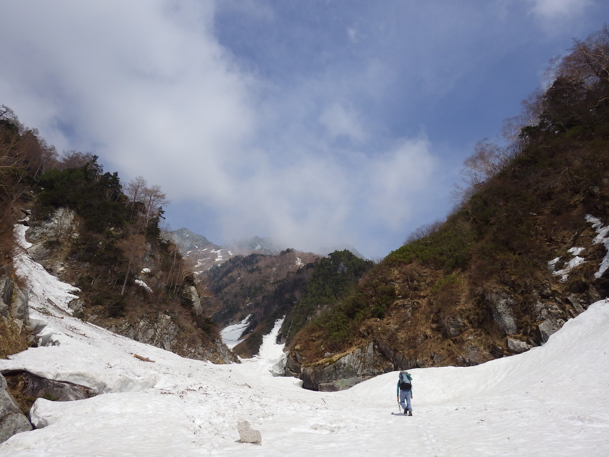 融雪の速さが異常との情報を得ていたので、渡渉に備えてアクステを用意していたが結局スノーブリッジをつなげることができた。スナクボ岩屋付近はゴルジュの様相だが、池ノ谷ゴルジュに比べると広く威圧感はない。ほどなく沢が開けると毛勝谷を合わせ、日本離れした広い東大谷出合となる。