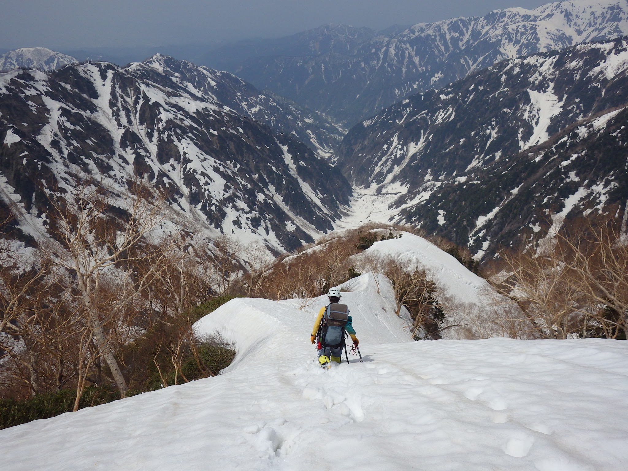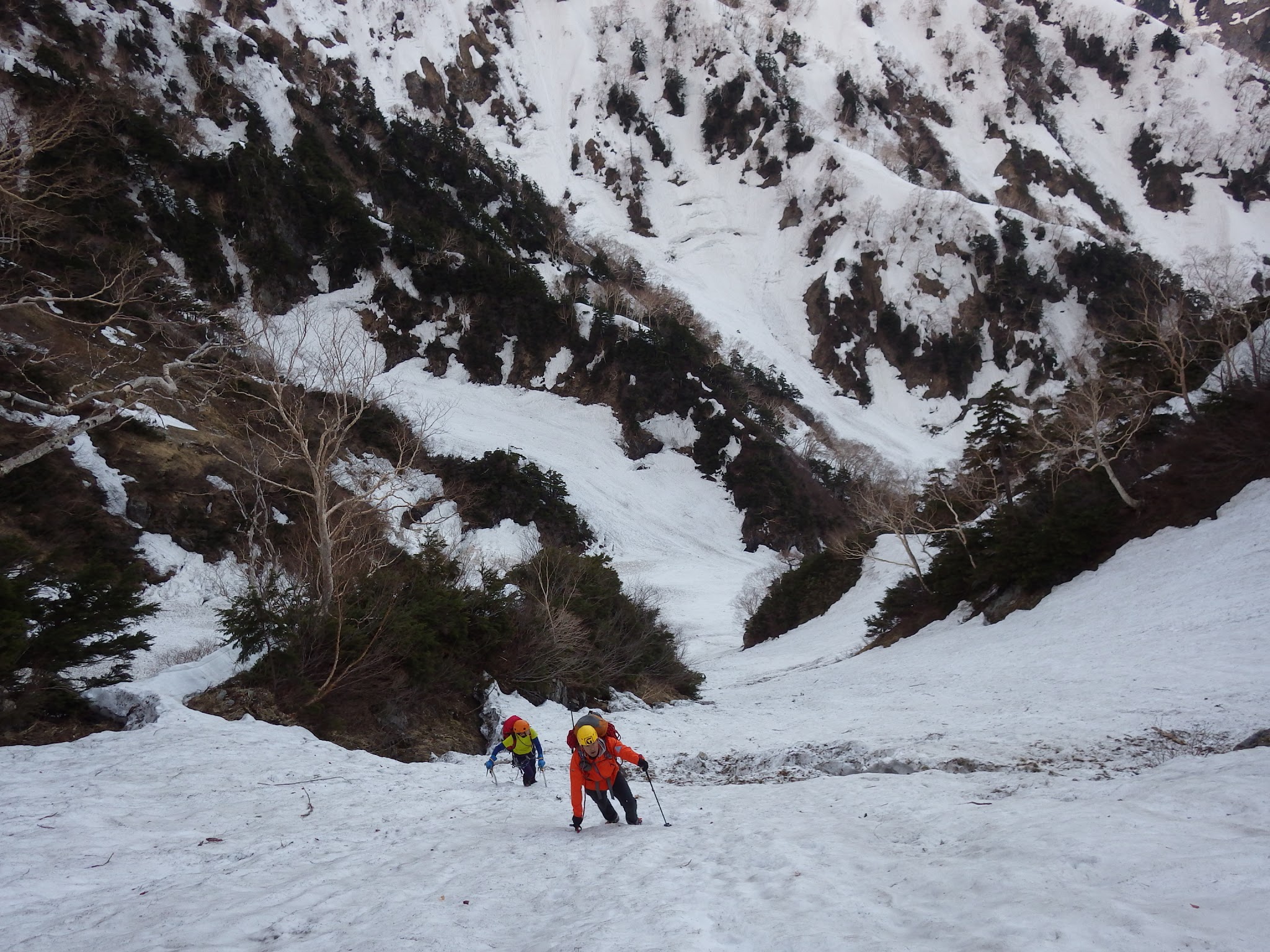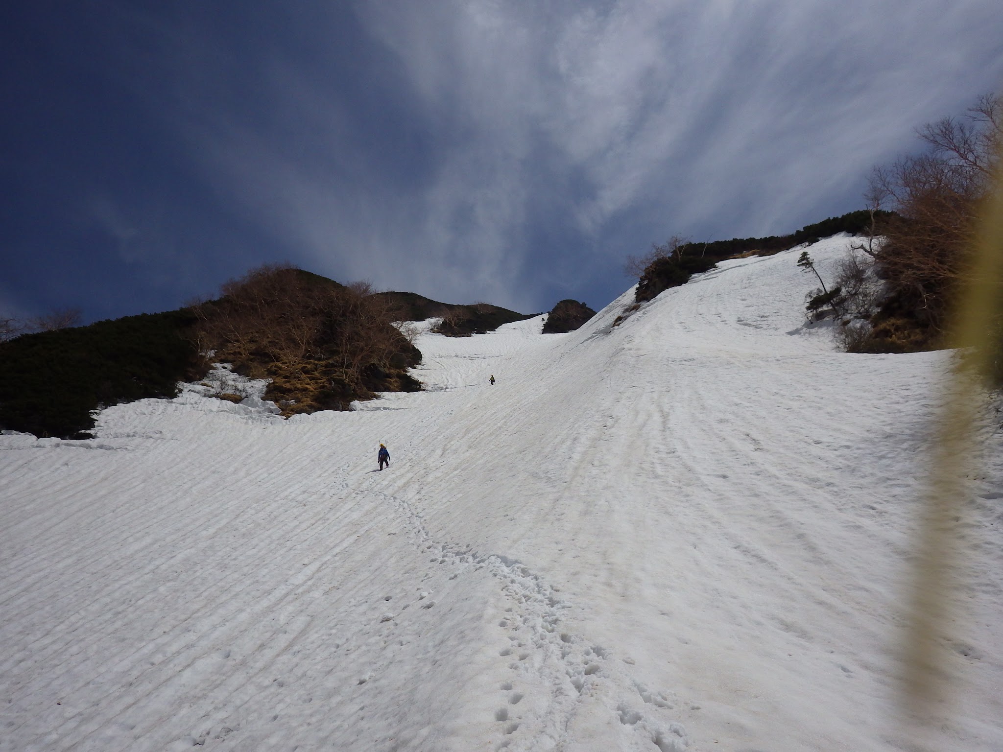 ひとつ目のピークから伸びるのが東大谷右尾根で、下降口を偵察していると下から2人組パーティーがやってきた。雪崩れそうなルンゼがありザイルを出した方が良い、一か所ギャップがあり悪いとアドバイスを受ける。傾斜はかなり急でバックステップも多用するが、トレースを利用できたおかげで結局ノーザイルで東大谷出合まで一気に下れた。