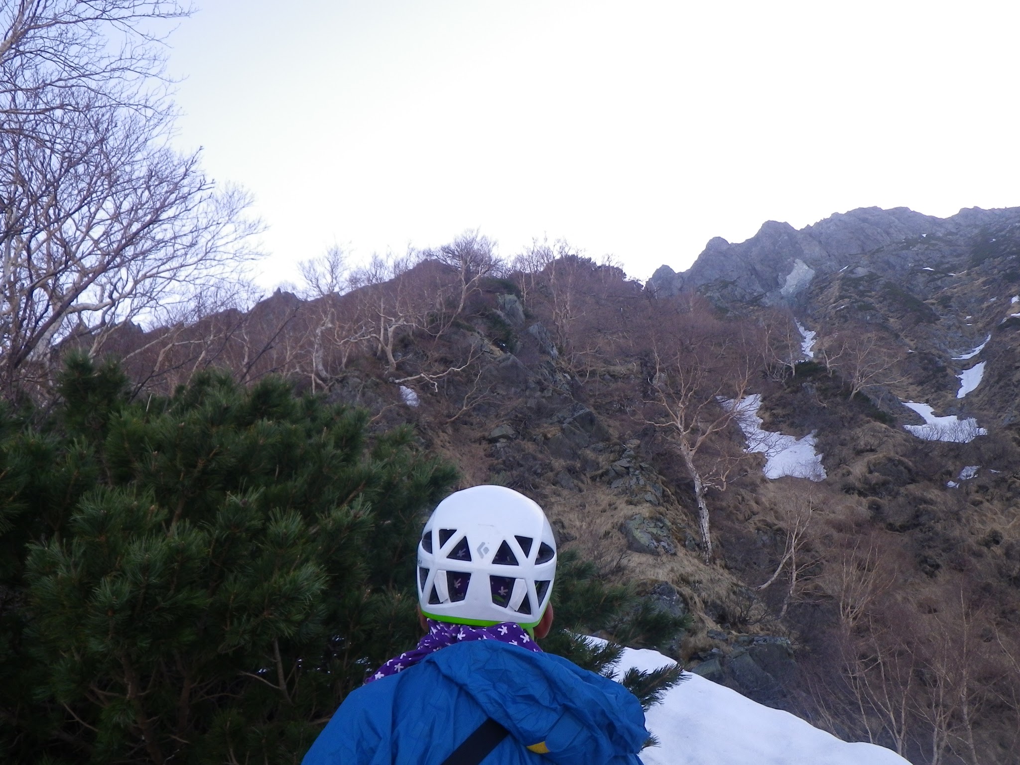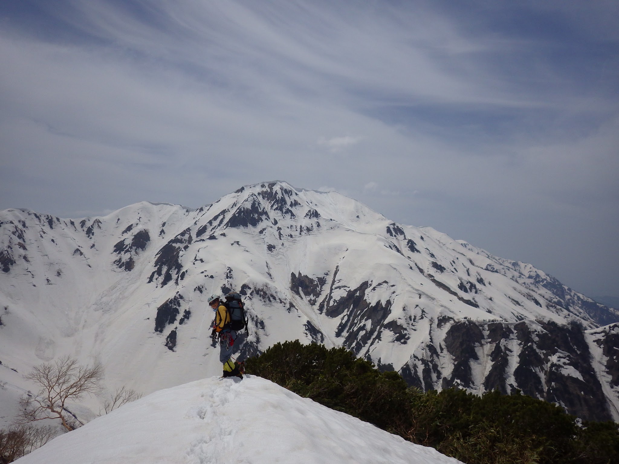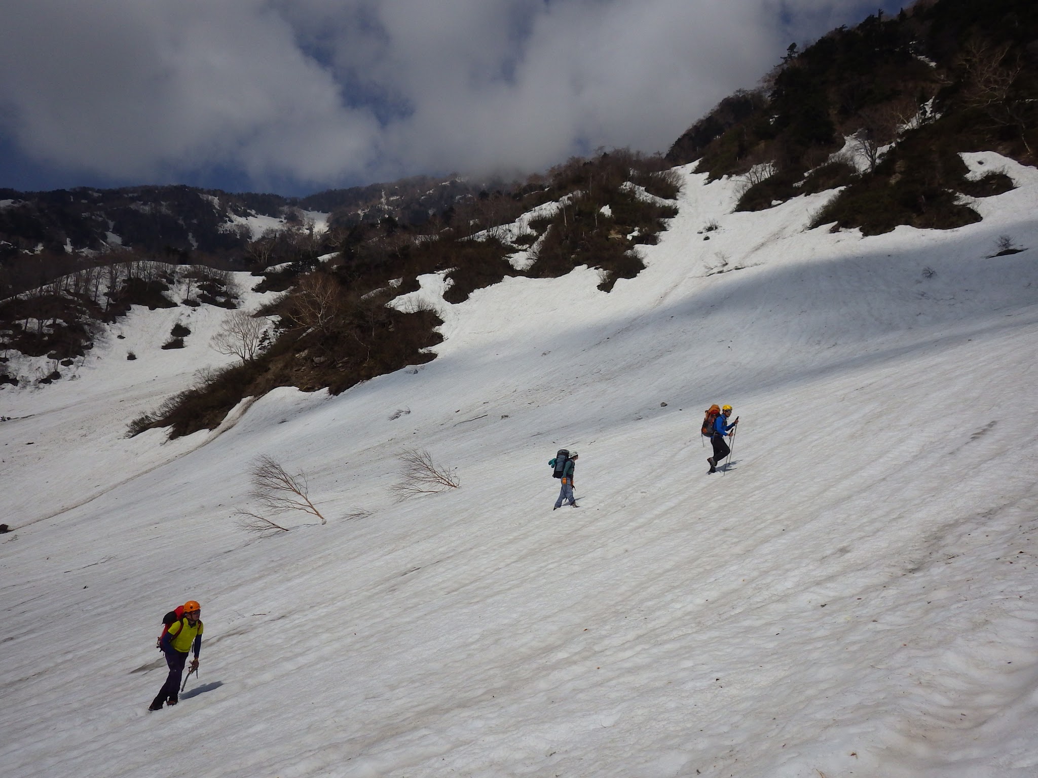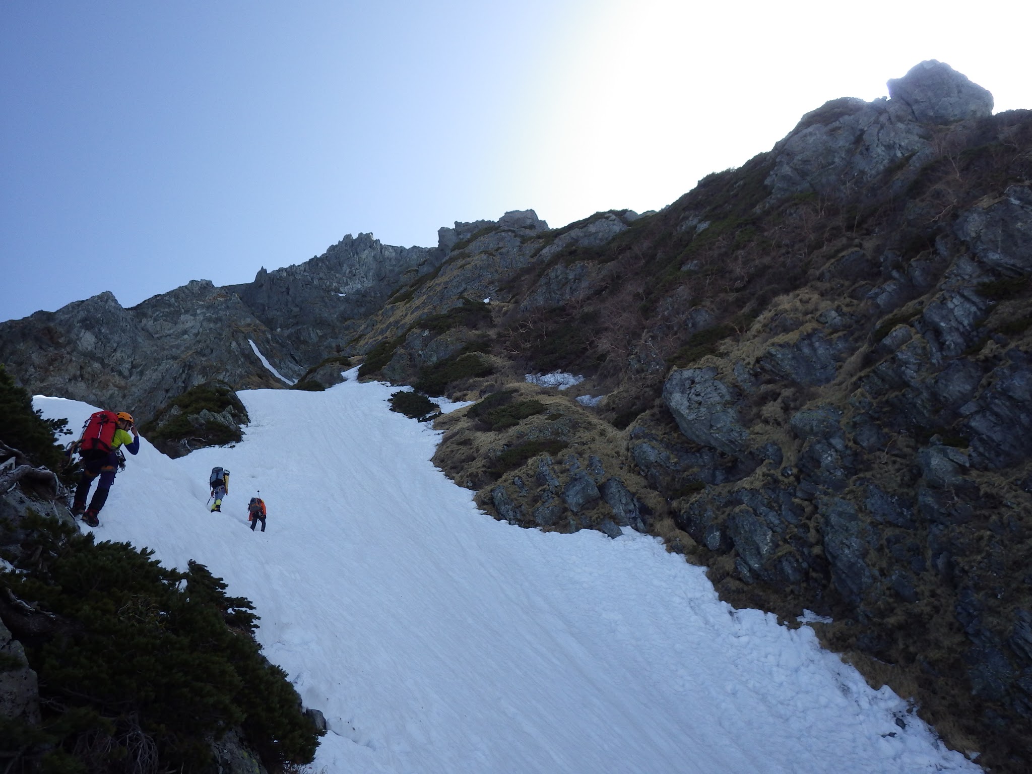 ひとつ目のピークから伸びるのが東大谷右尾根で、下降口を偵察していると下から2人組パーティーがやってきた。雪崩れそうなルンゼがありザイルを出した方が良い、一か所ギャップがあり悪いとアドバイスを受ける。傾斜はかなり急でバックステップも多用するが、トレースを利用できたおかげで結局ノーザイルで東大谷出合まで一気に下れた。