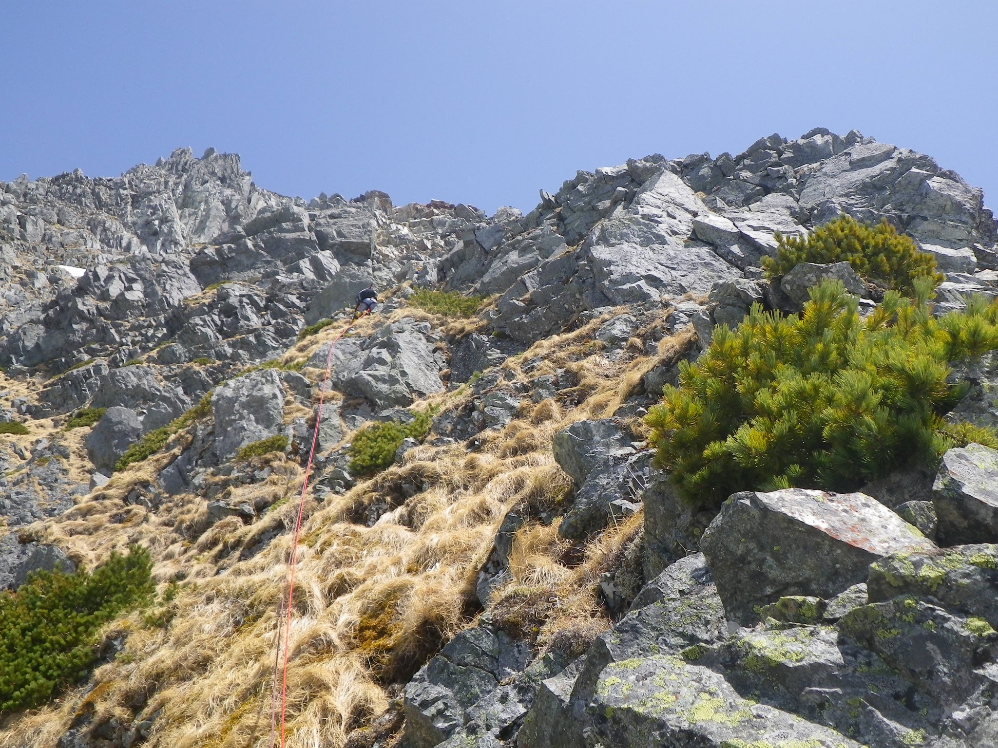 ピークを乗り越えると雪田が現れ、さらにⅡ級程度の岩稜をノーザイル進むと尾根は早月尾根の側壁に吸い込まれる。荒れたボロ壁が立ちふさがっている。
