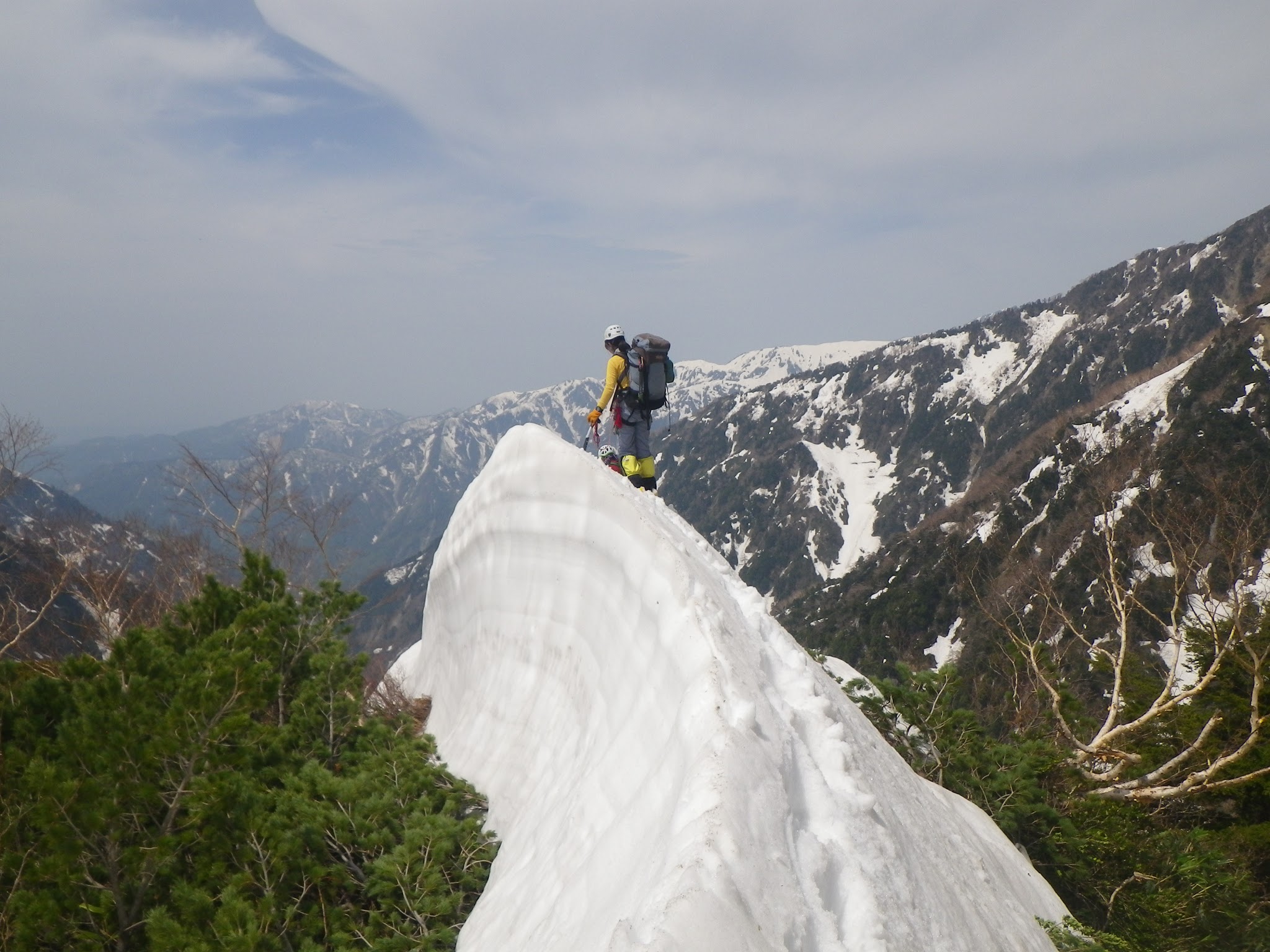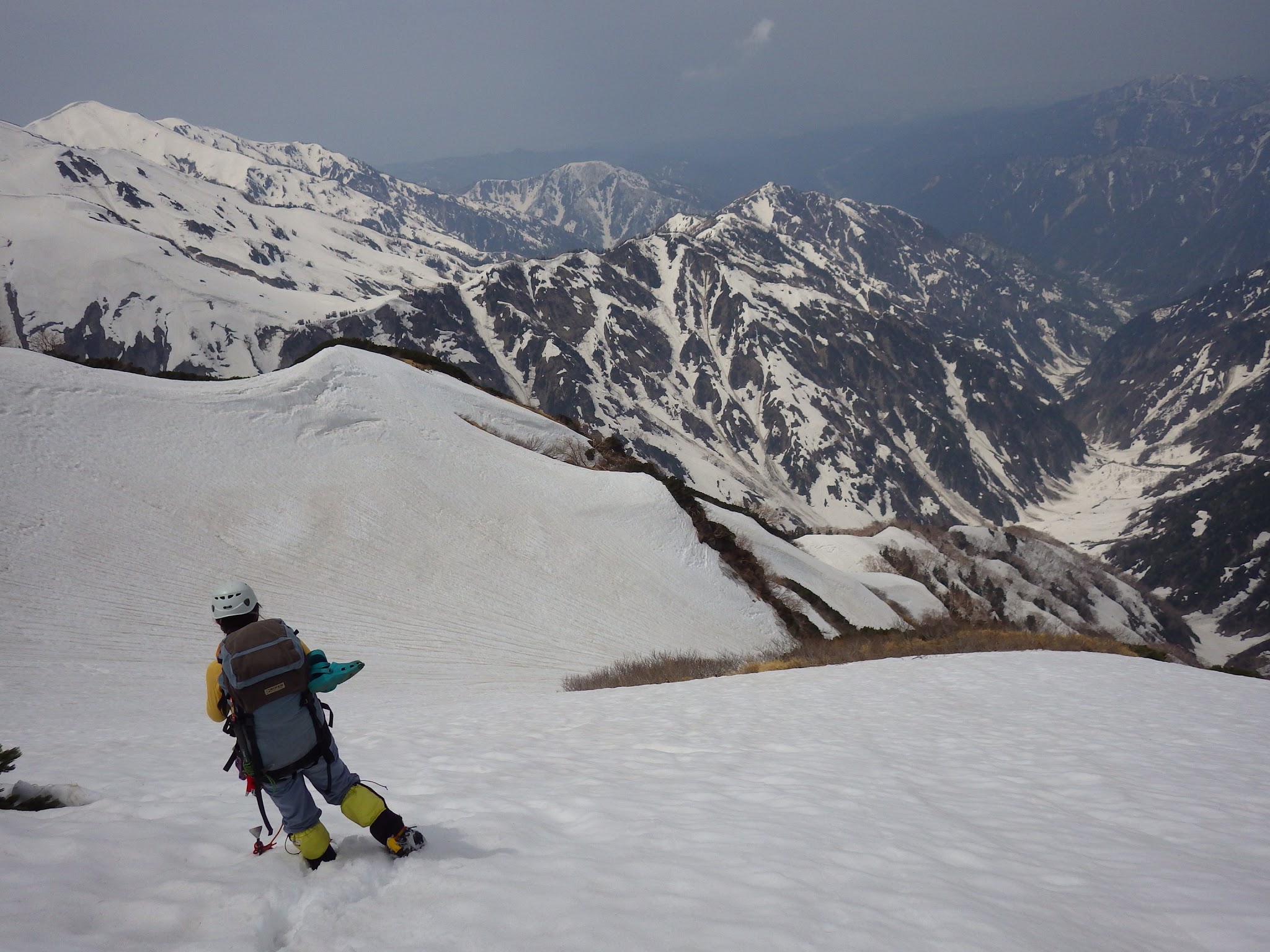 早月尾根分岐で別山尾根を確認すると雪が少なく容易にこなせそうなので、まずはカニの横ばいを下る。平蔵の頭から前剣までほとんど夏道。前剣では東尾根を確認するが中途半端な雪が残る劣悪な様相で翌4日の悪天予想もあり割愛。前剣から先は夏道から離れ雪面を行く。一服剣を越えてクロユリのコルから剣御前の稜線へ這い上がる。