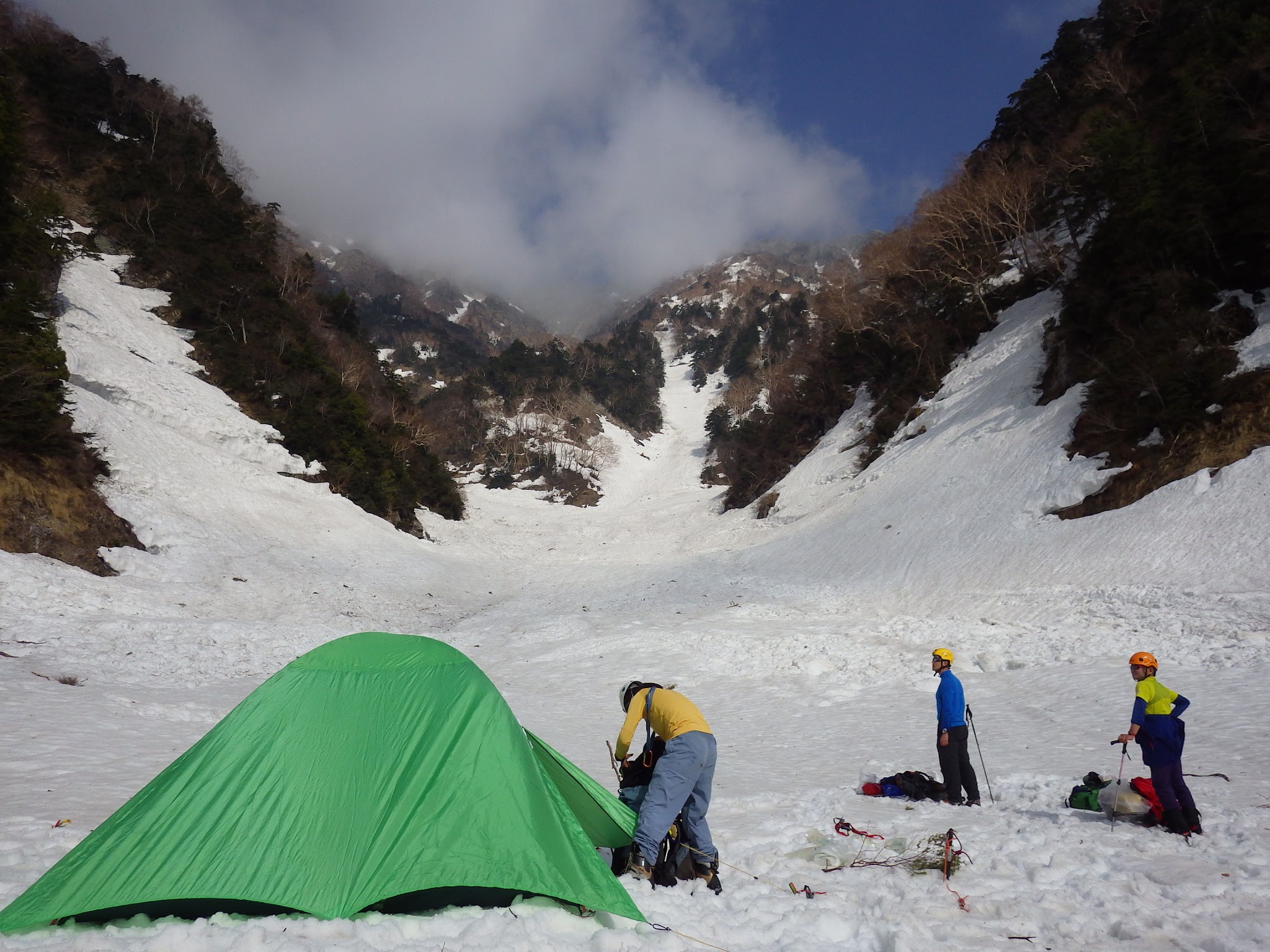 空荷で谷を詰めて翌日の取り付き確認した後、尾根末端の水を汲み、初日だけ豪華なすき焼きで疲れを癒す。