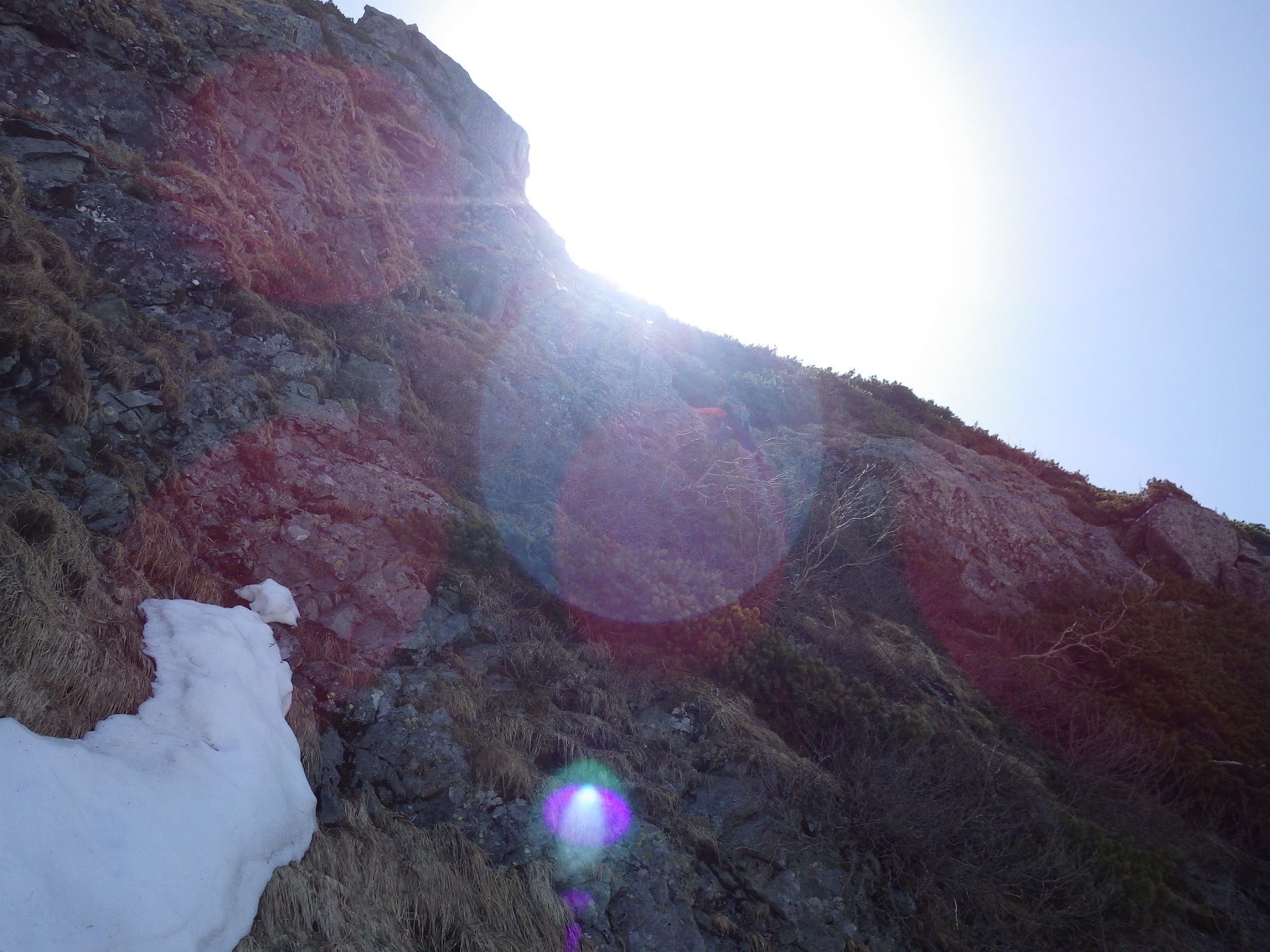 雪壁の急登から、稜線に出るとブッシュ。圧倒的に雪が少ない。