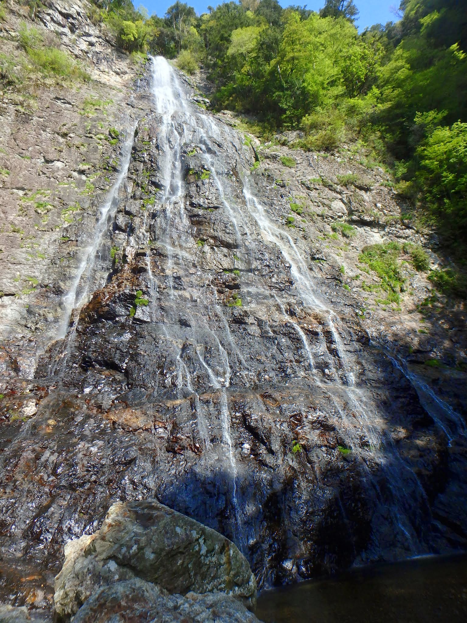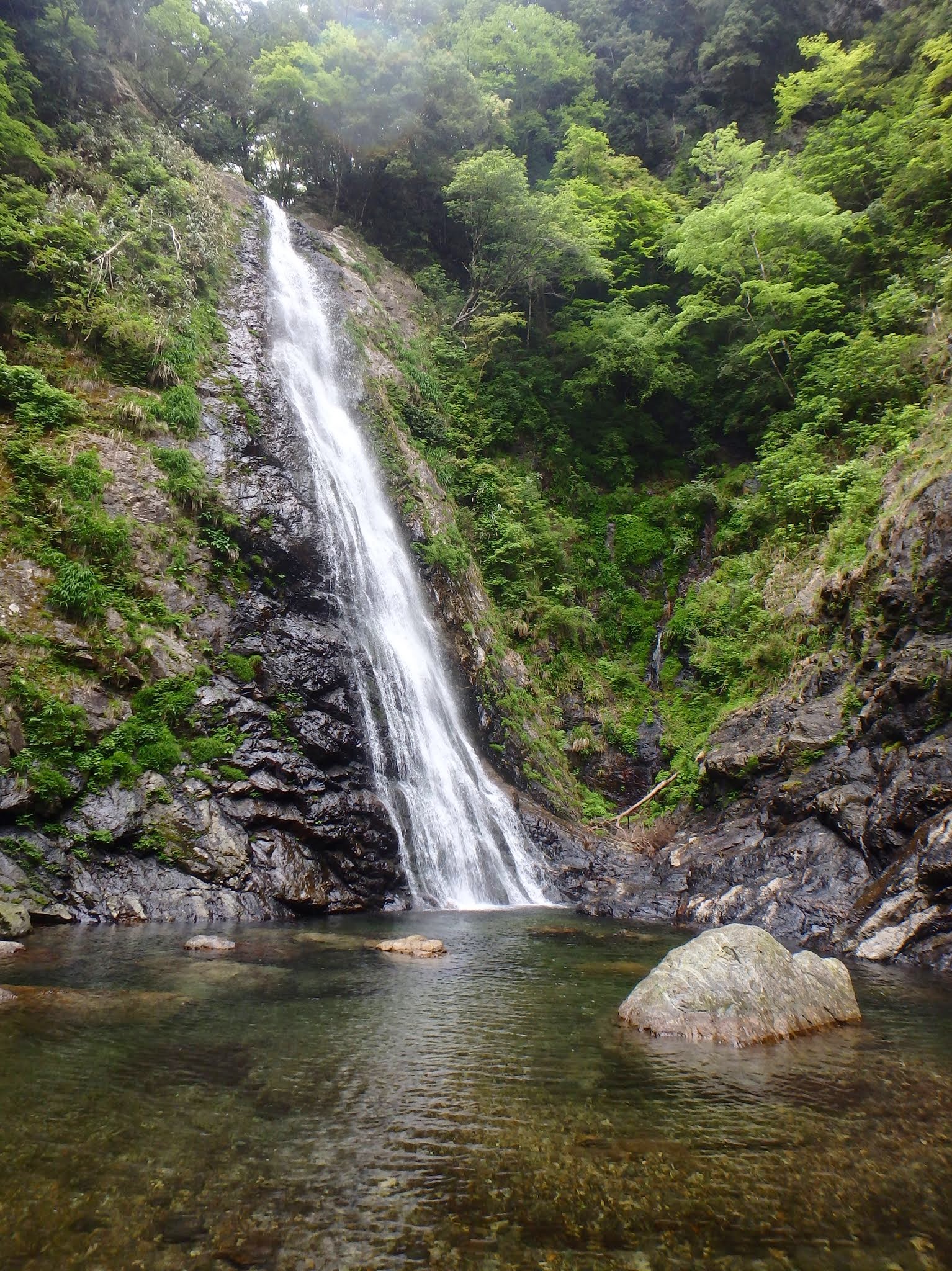 いやらしい泥付きトラバースを経ると、眼前にシャワー状の雌滝70mが登場。