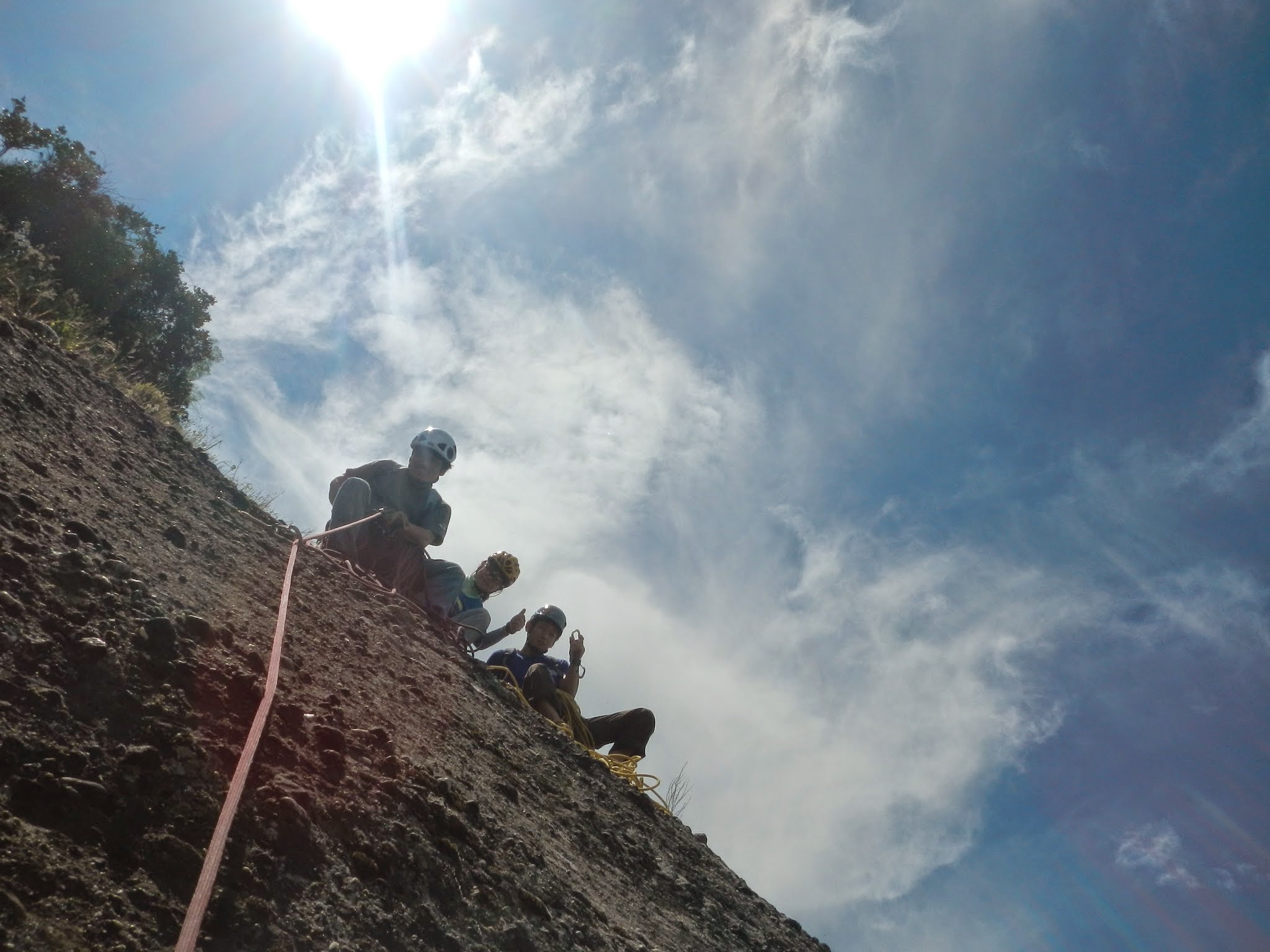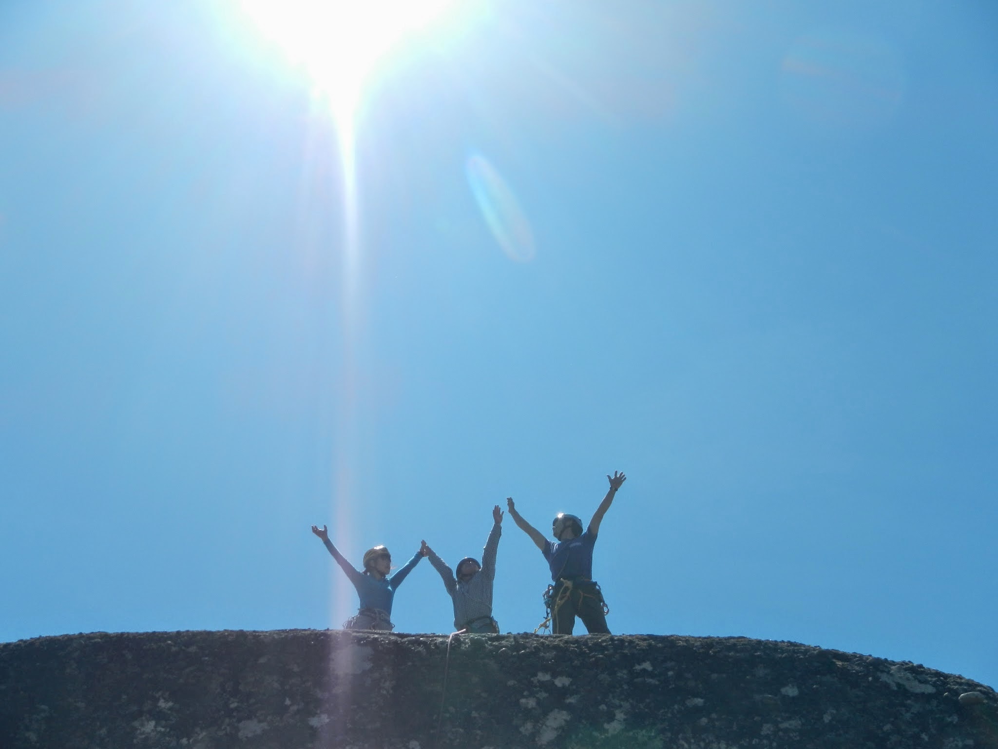 ガツッと卵岩へ張り付いたら、あとは5.10c位の楽しいフェイスを登るだけ。頂で待っていてくれた皆の笑顔が満足感に溢れていました。