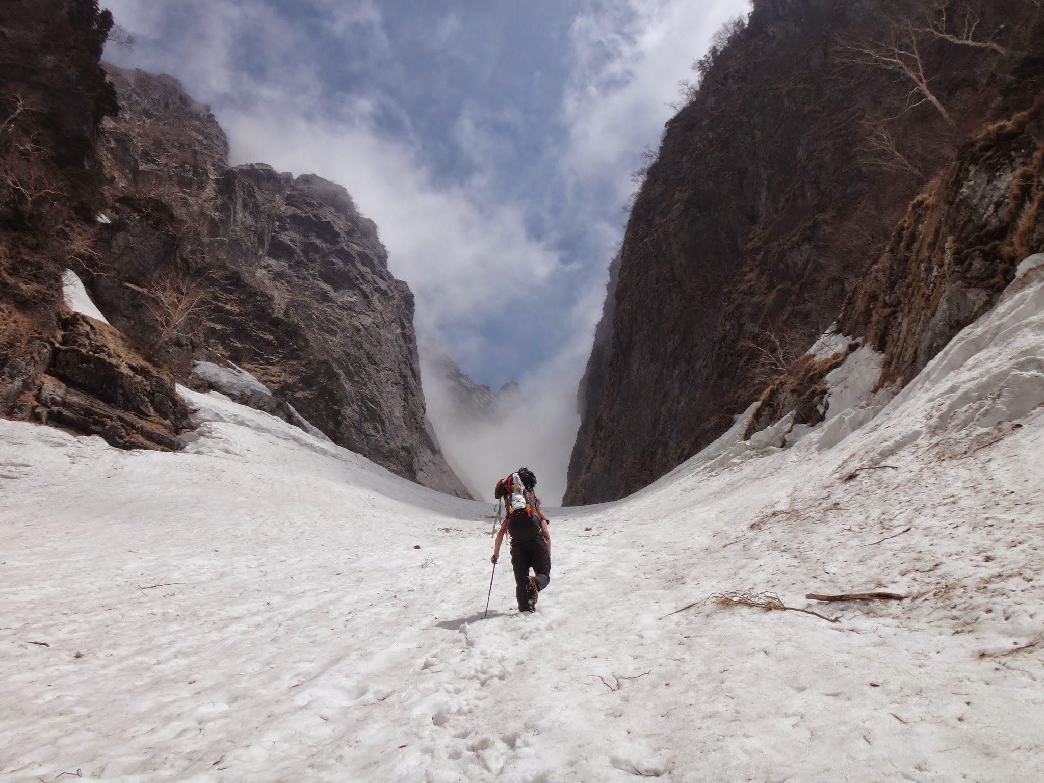 去年は3回した渡渉は1回のみ。池ノ谷ゴルジュも谷底が広く明るい。二股過ぎからは、アイス&アルパインのフル装備と雪渓上にいるとは思えないほどの照りつける太陽が体力を奪う。R4には、一片の氷雪も見当たらない。