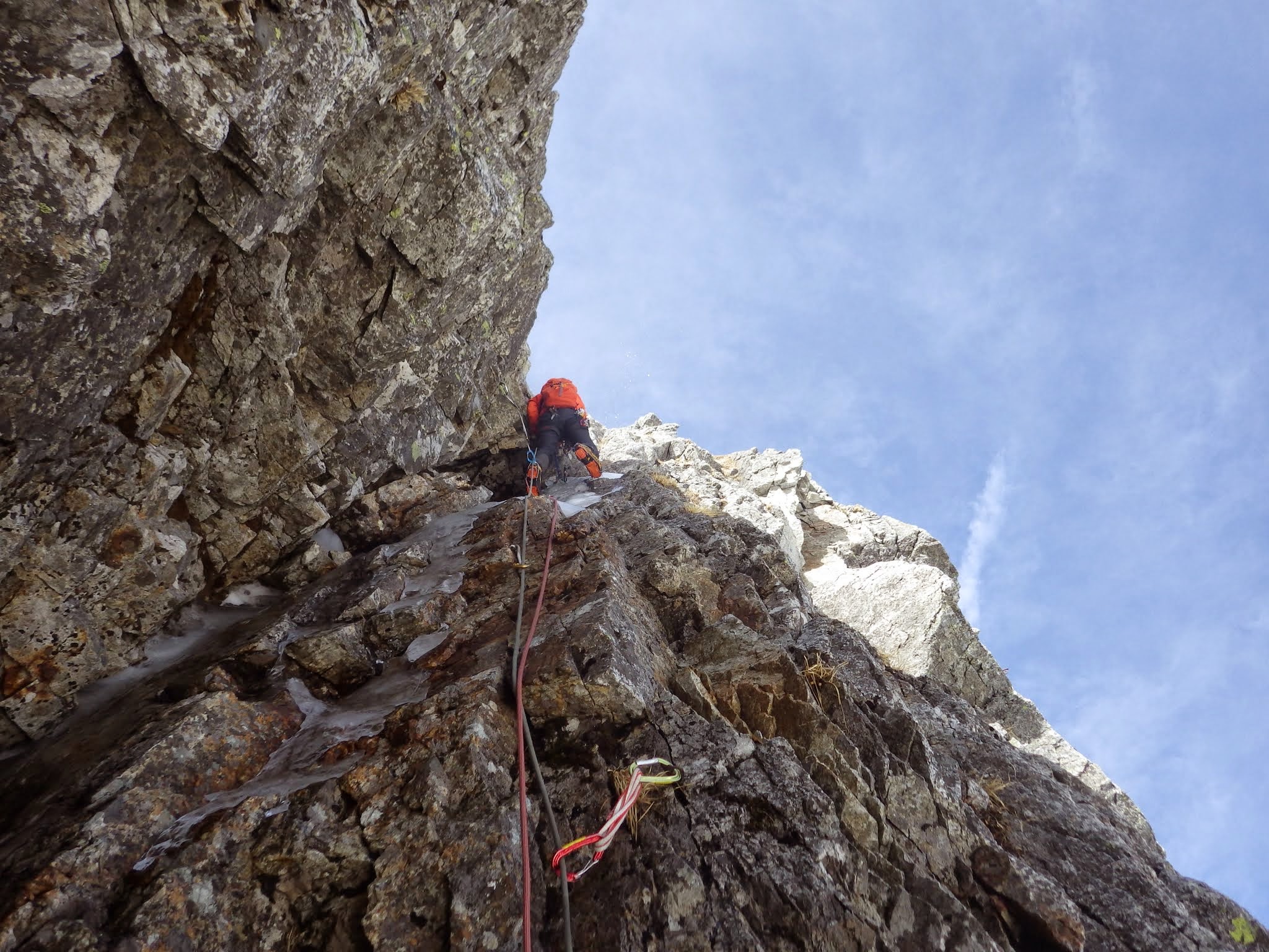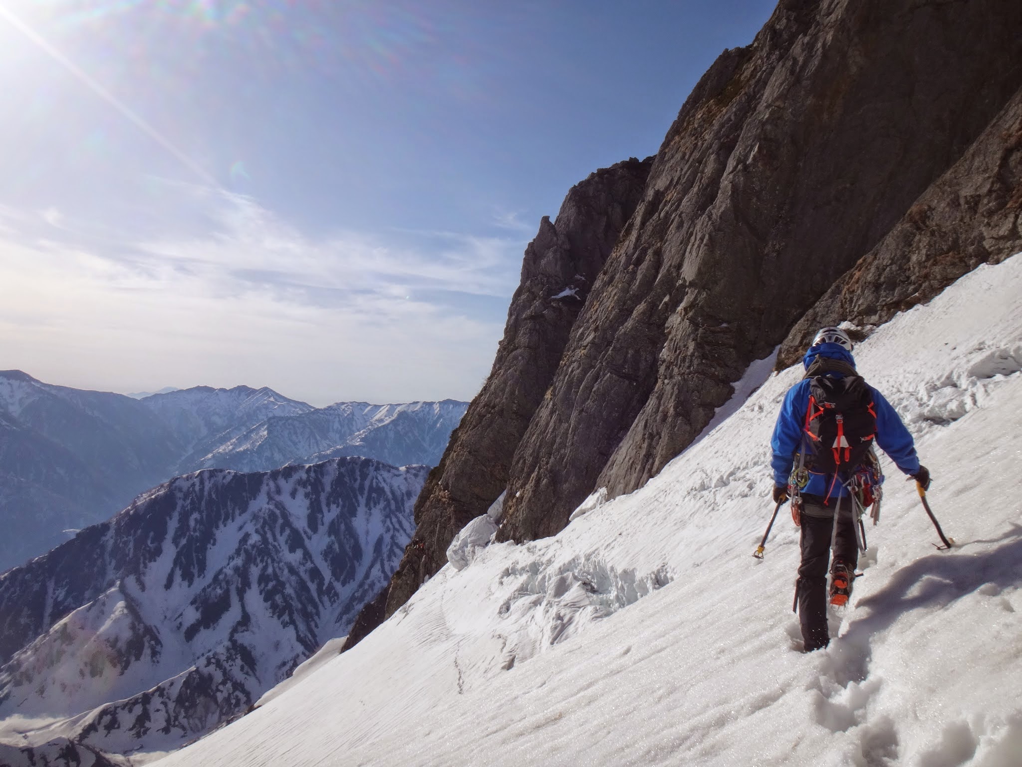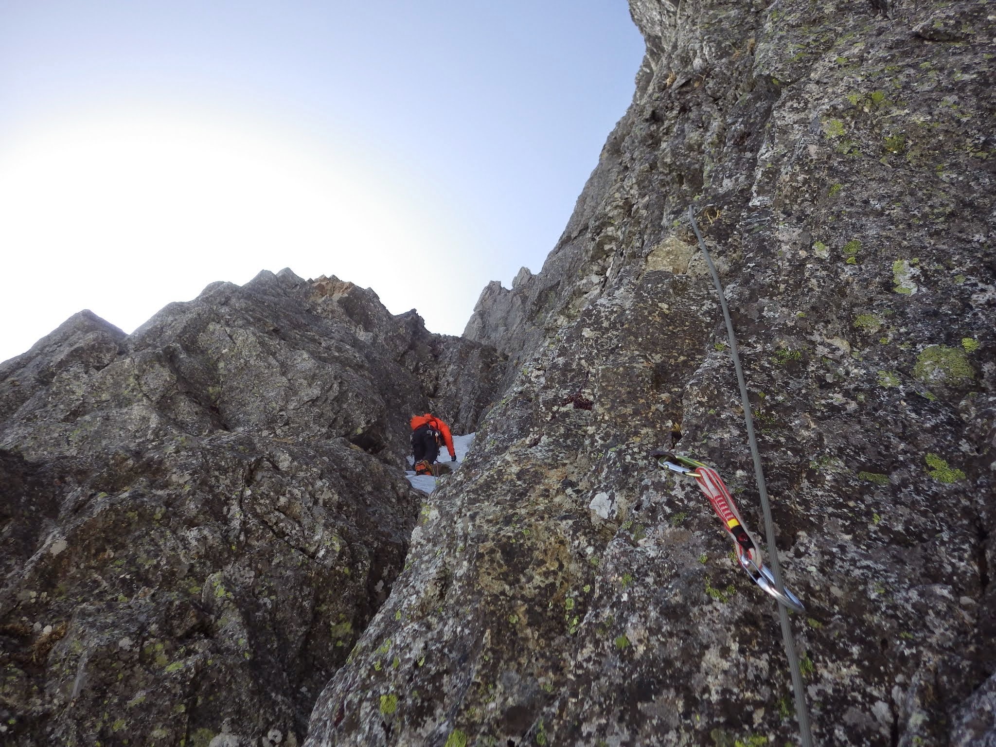 手も足も渋い。氷の下にはハーケンが透けて見える。ガバも氷の下なのか。ベルグラを引っ叩いて全部剥がしてやりたいが、ビレイヤーを直撃するから始末に悪い。左に被さる側壁に身体を寄せたり、アンダーホールドを探ったり、騙し騙しのクライミング。少し氷の厚くなった上部で、赤スクリュー(10cm)にクリップし、やっと一息入れる。氷雪のルンゼを20m程登り、雪を避けるように設置された岩上のビレイ点へ。