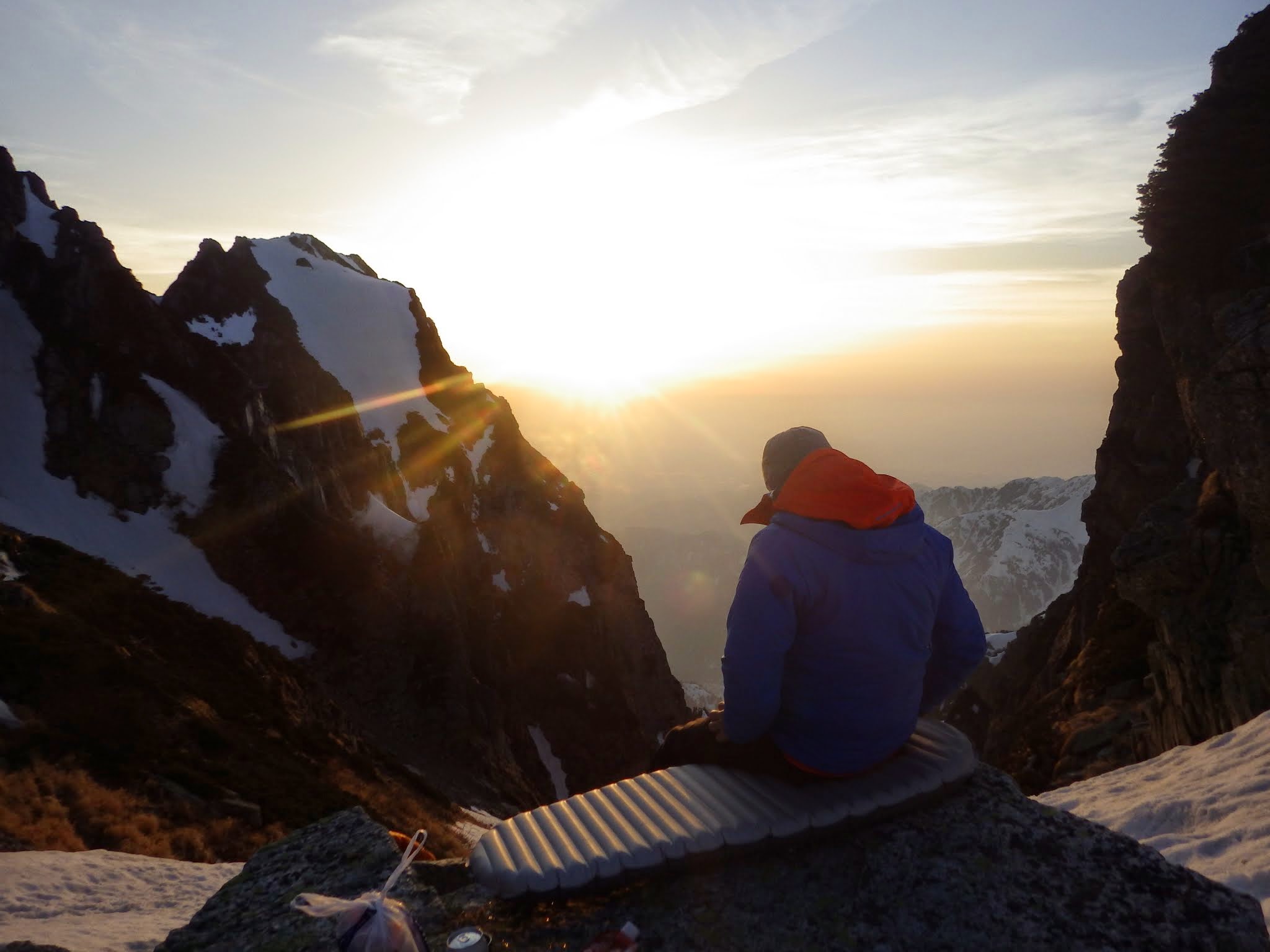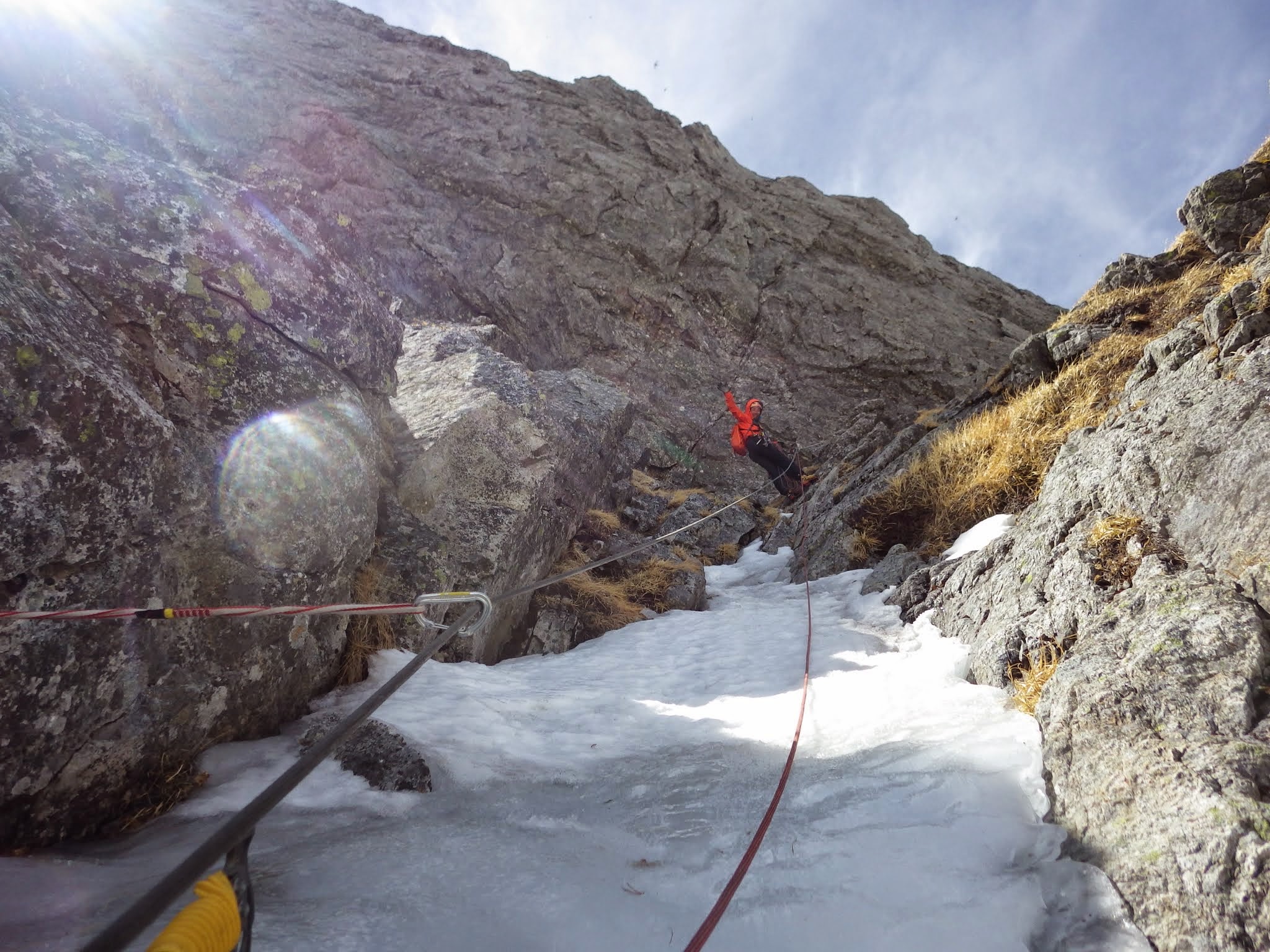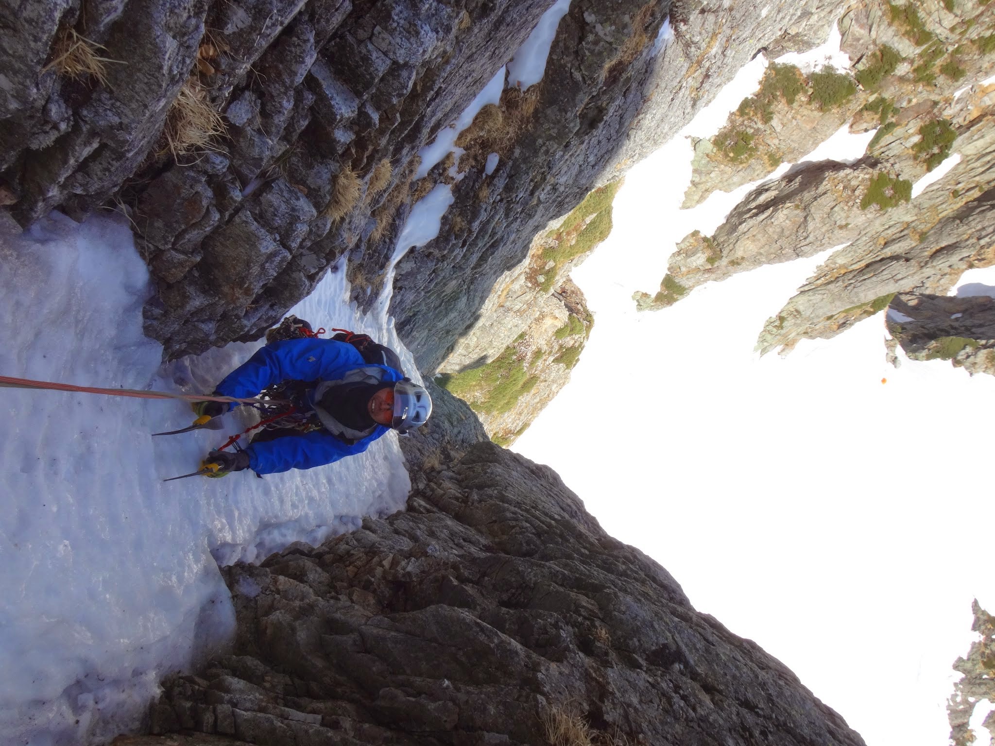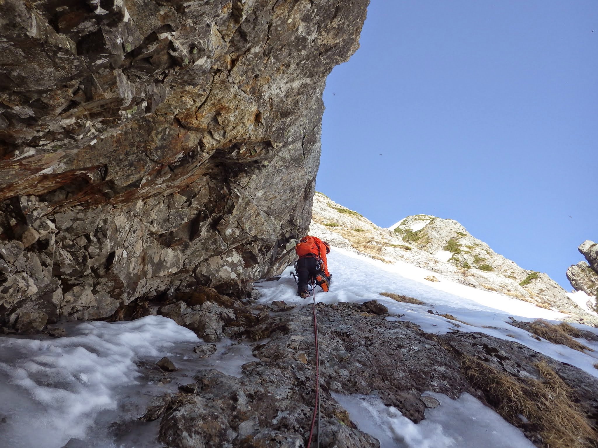 手も足も渋い。氷の下にはハーケンが透けて見える。ガバも氷の下なのか。ベルグラを引っ叩いて全部剥がしてやりたいが、ビレイヤーを直撃するから始末に悪い。左に被さる側壁に身体を寄せたり、アンダーホールドを探ったり、騙し騙しのクライミング。少し氷の厚くなった上部で、赤スクリュー(10cm)にクリップし、やっと一息入れる。氷雪のルンゼを20m程登り、雪を避けるように設置された岩上のビレイ点へ。