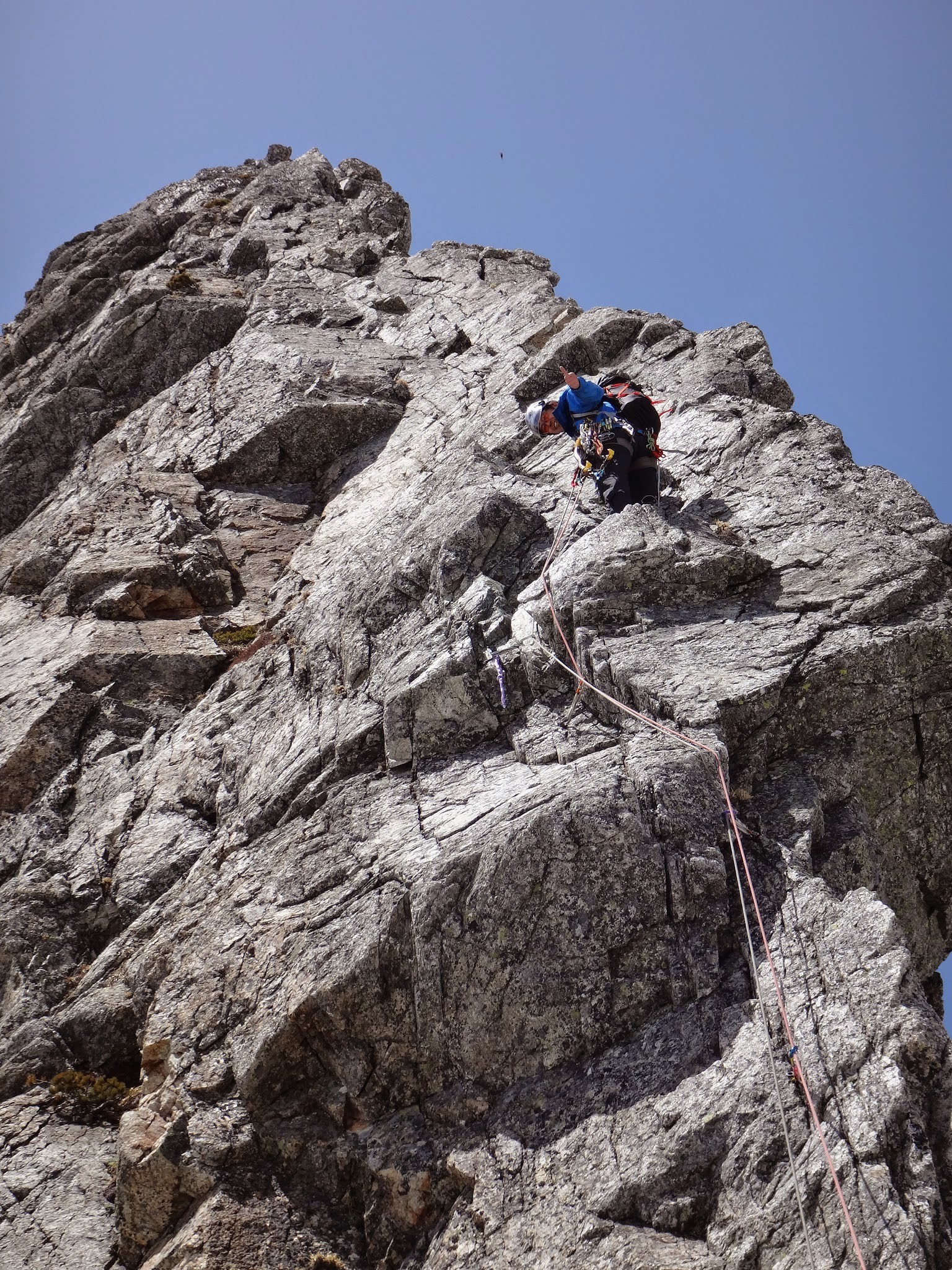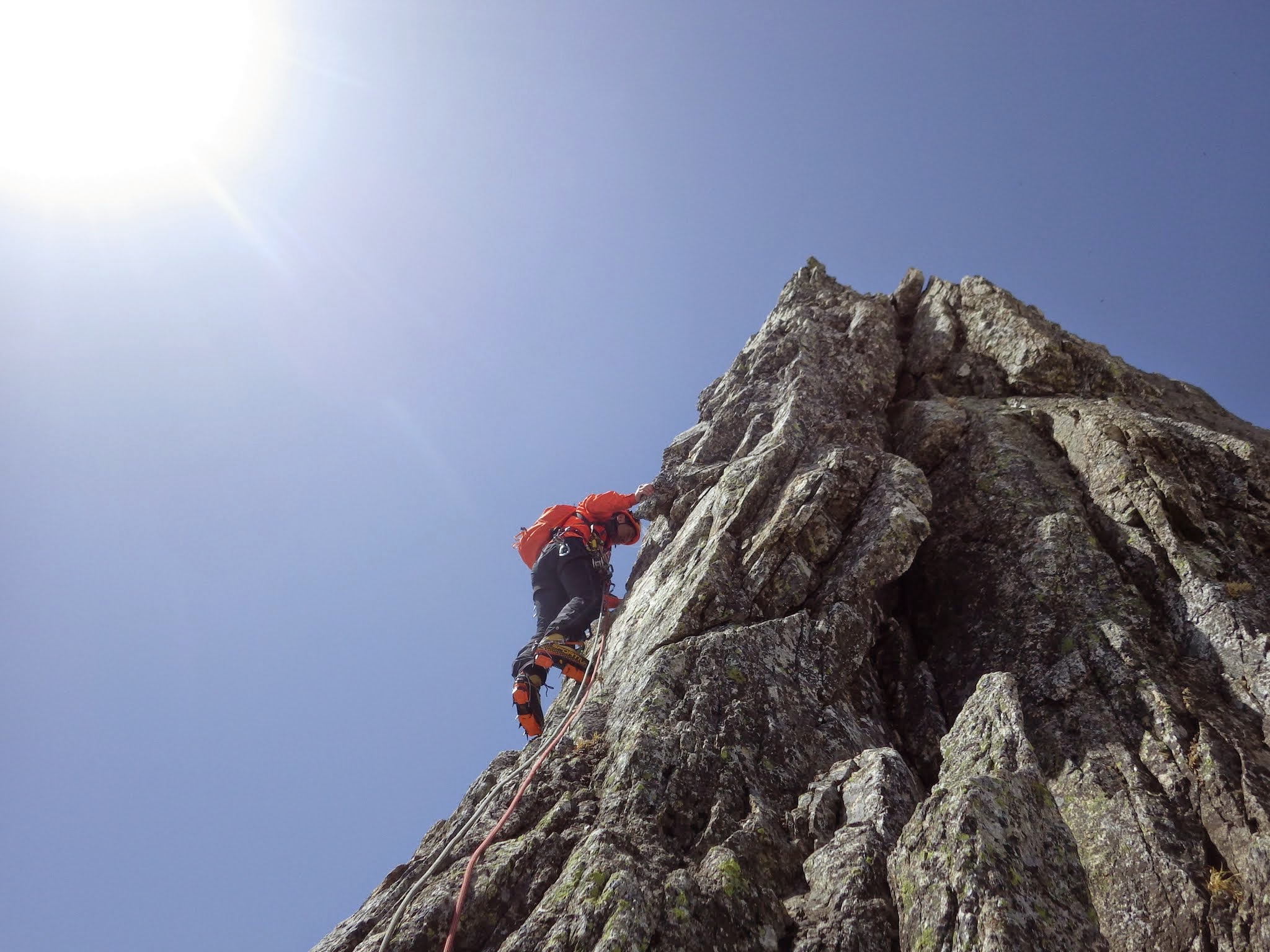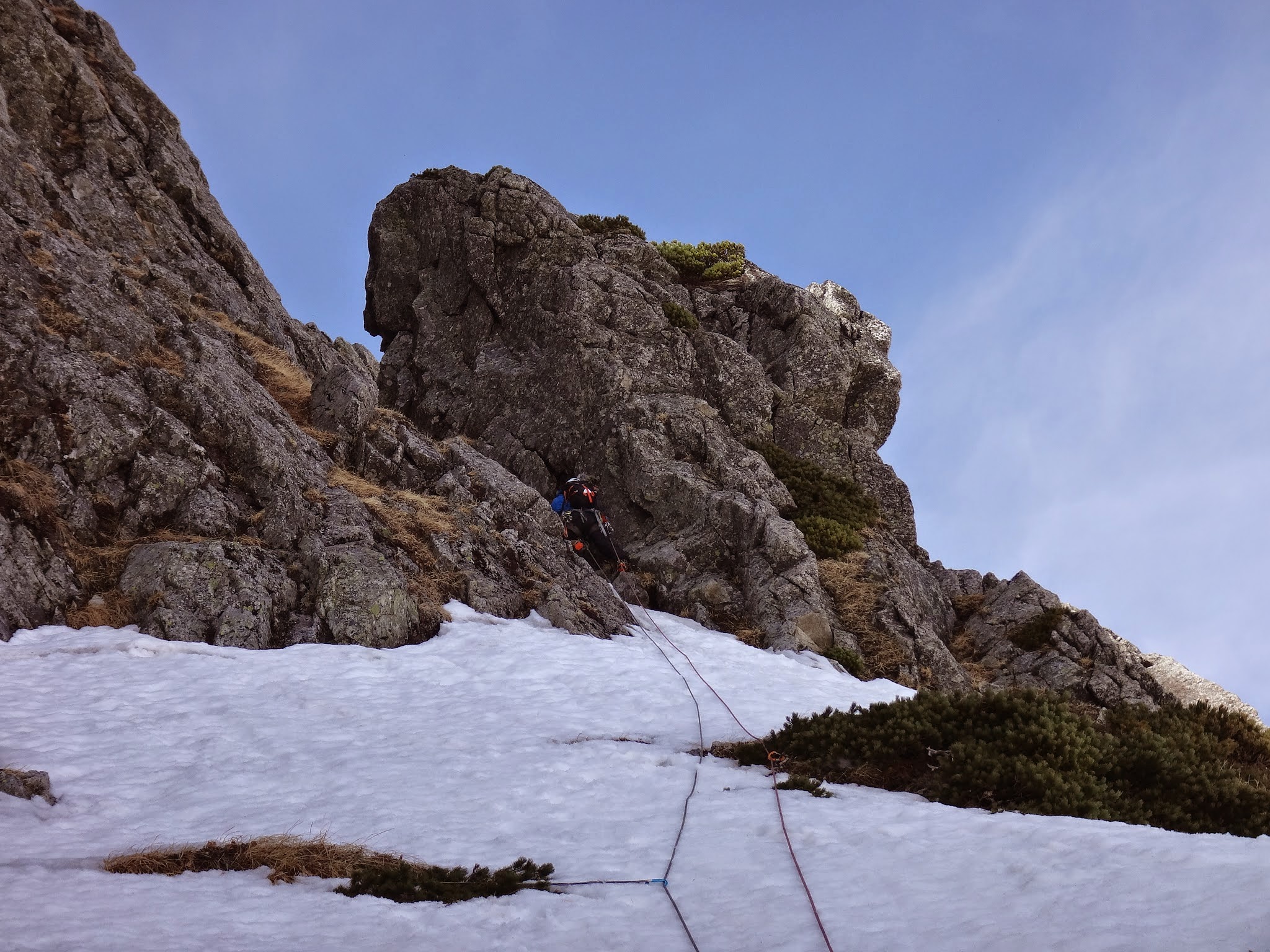 ルンゼを直上し、突き当りにある掛りの浅いピナクルにランナーを取り右上。強傾斜のルンゼに氷は無く、右のフェイスのクラック沿いを登る。適度なガバと、グローブを着用してハンド〜フィンガーサイズクラック。上部は残置が少なくなりカム中心。動きに変化がある楽しいピッチ。気温は高いが、ルンゼに日は当たらない。