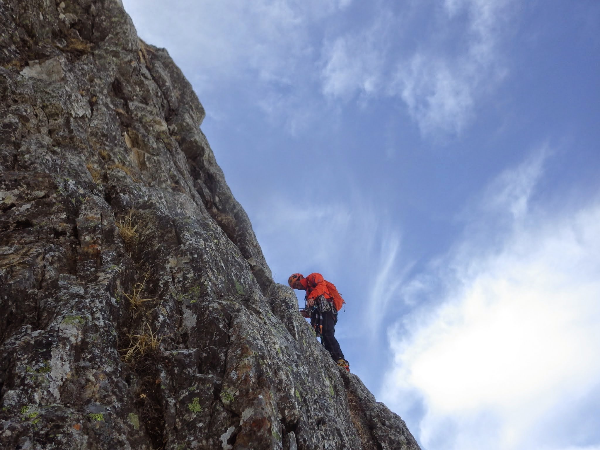 乾いた岩を残置にカムを混じえつつ進む。右上する岩溝はバランスが良くない。「所詮3級」だけにロープの伸びが鈍る。風強く日当り無し。冷える。