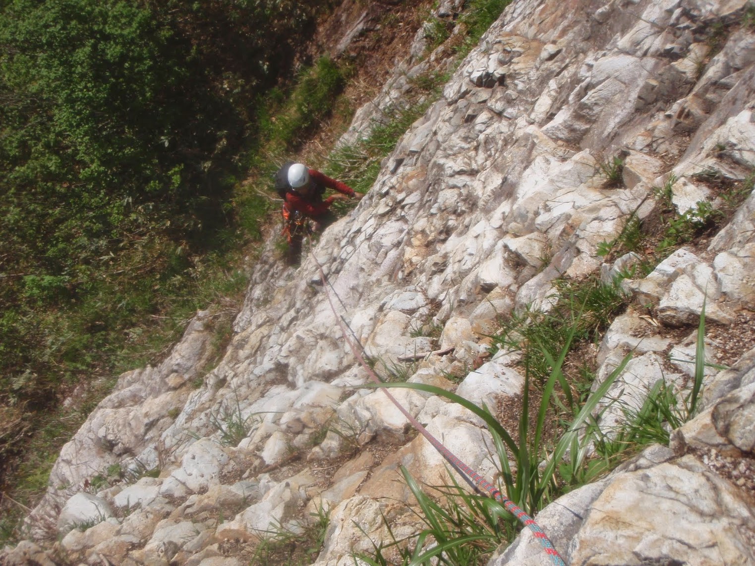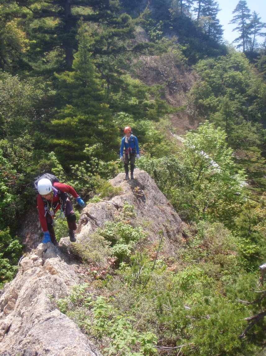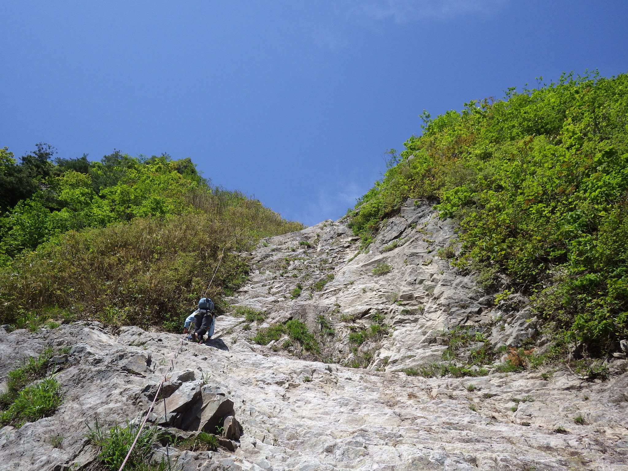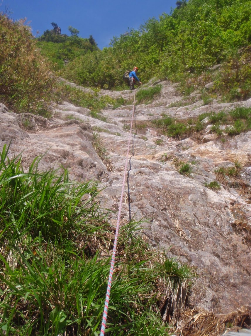 2ピッチ目 50m 出だし5m程の立っているスラブ、残置があったが古いので、ブッシュ絡みで緩傾斜のスラブへ緩傾斜のスラブをフリーで行くとすぐ二俣。右に進みロープを出す