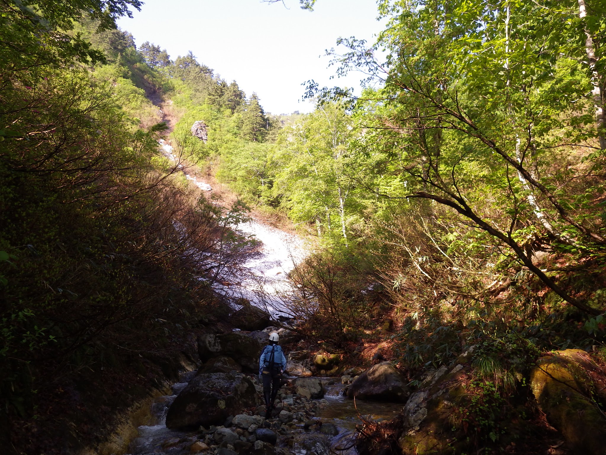 これで冷水に浸からなくて済むと安堵。すると「おーい」と上の方から人の声、見上げると右岸上部の樹林帯に翁が!山菜採りのようで、私は何がそんな上で採れるのか気になって仕方がなかった。声もよく聞き取れないくらいの距離だったので聞くのは諦め、先を急ぐ。