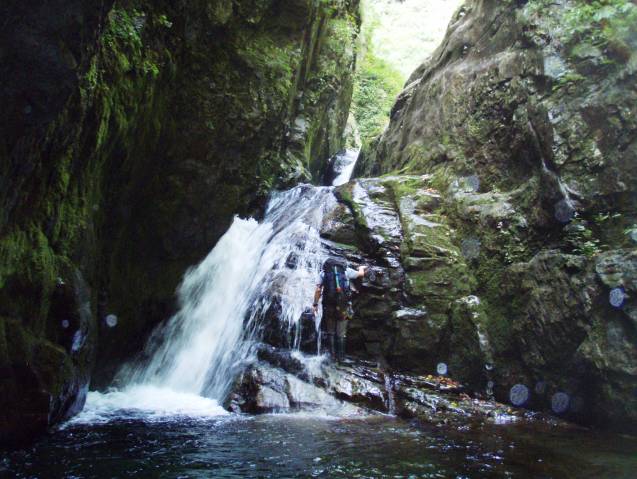 2~3mのナメ滝が続く。その後、釜を持った7m滝。ぬめりはあるが、左側から登れそう。ルート検討中に左岸に残置ロープを発見、それに誘われ左岸を高巻くが、滝横登れたかもなあー、と心残り。しばらくゴーロと小滝が続き、倒木の2m滝を過ぎると突然薄暗いゴルジュが現れる。