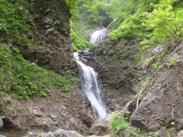 06:15スタート~06:50引き返し~07:20再スタート~08:45稜線~10:00″680″m二俣~11:00″600M”滝の巻き~30M懸垂~14:00小ヒグラ沢出合堰堤~14:20岩菅橋~15:00車