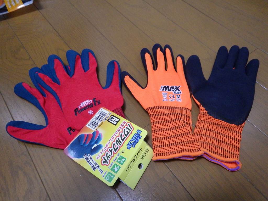 組み合わせると今のところは「発泡天然ゴム」がベターかな。上記オレンジのMAXと書いてある作業用背抜きグローブがそれです。ワークマンで買いました。