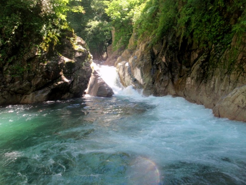 そして続いて現れるのは、溺死事故も起こっているという噂の大釜淵。ここは一度渦に引っ張られると、永遠に戻れないエンドレスな軌跡を描き続けるので、ザイルで確保してからアタック。