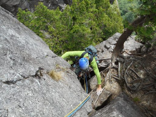 クライムダウンを数回繰り返すがピナクルまでが良くない。乾いてないチムニーからピナクルを越えてから、クラック、フェースで高度感あり。