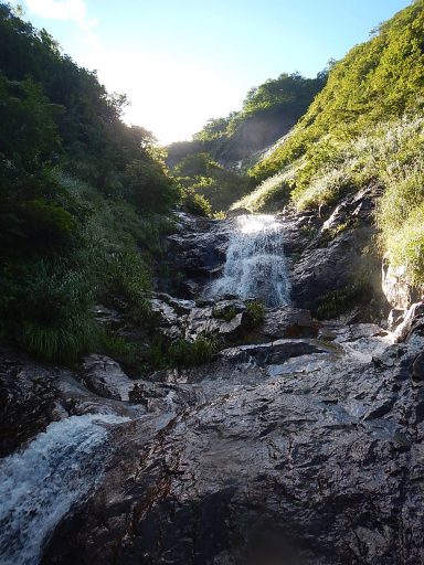しかもここが大当たり。途中の30mスラブ滝や、遡行中に見えるスラブ壁の景観もなかなか、水量豊かな登れる小滝が源頭まで続き、レベルを問わずに楽しめる沢だと思います。