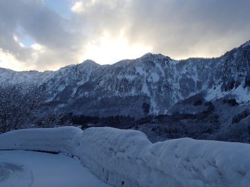 気温の上昇でアイゼン団子に悩まされながらひざ下ラッセルを3人で回すが、平成生まれの23歳のK野さんが大活躍。無風快晴で苗場東面・佐武流山から奥志賀の山々が一望でき、白嵓の頭から先のなだらかな斜面で幕営。