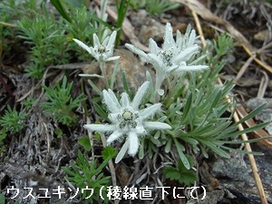 稜線直下にはエーデルワイスで有名なウスユキソウが咲いている。これは花なのか?肉厚なガクといった感じで、不思議な形だ。登山道をたどって、オキの耳、肩ノ小屋、熊穴沢の避難小屋を経由して田尻尾根に入る。本日中に帰宅したいK岡さんは終電の時間が気になる。ロープウェイはまだ動いているみたいだが、きっと人は乗せてくれないだろう。下りは勢いがついて小走りになってしまう。何とかヘッドライトを使わず、8時前にベースプラザに到着。N村さんとK岡さんは15分ほど遅れて到着。挟間さんを迎えに行くついでに、K岡さんを送ってN藤さんに車を出していただく。