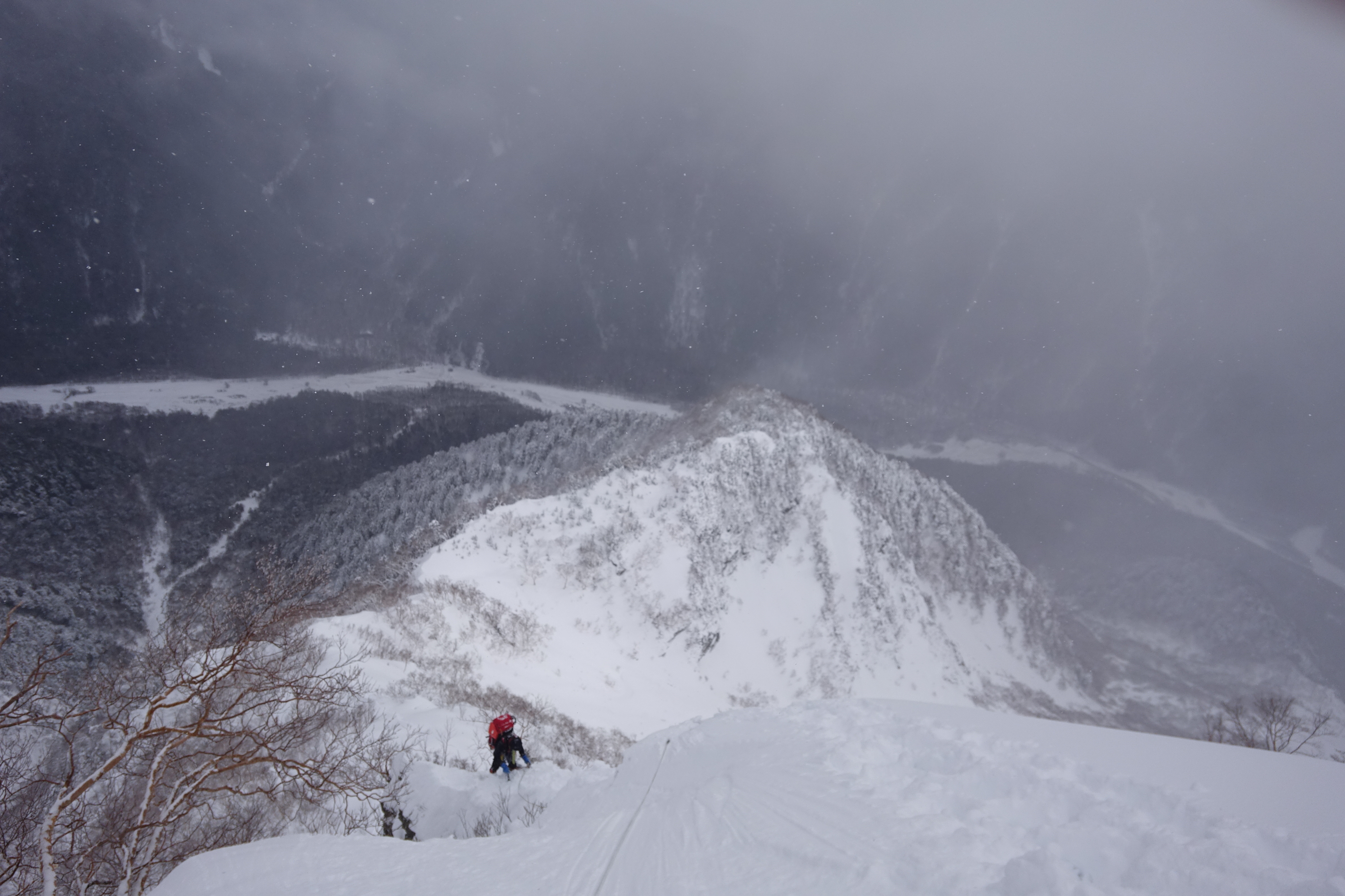 第一階段は草付きに薄い雪が付いた感じで藪に支点取りながら登る感じ。残置はほとんど見えない。 2ピッチロープを出して悪い急傾斜面から尾根に出て進む。