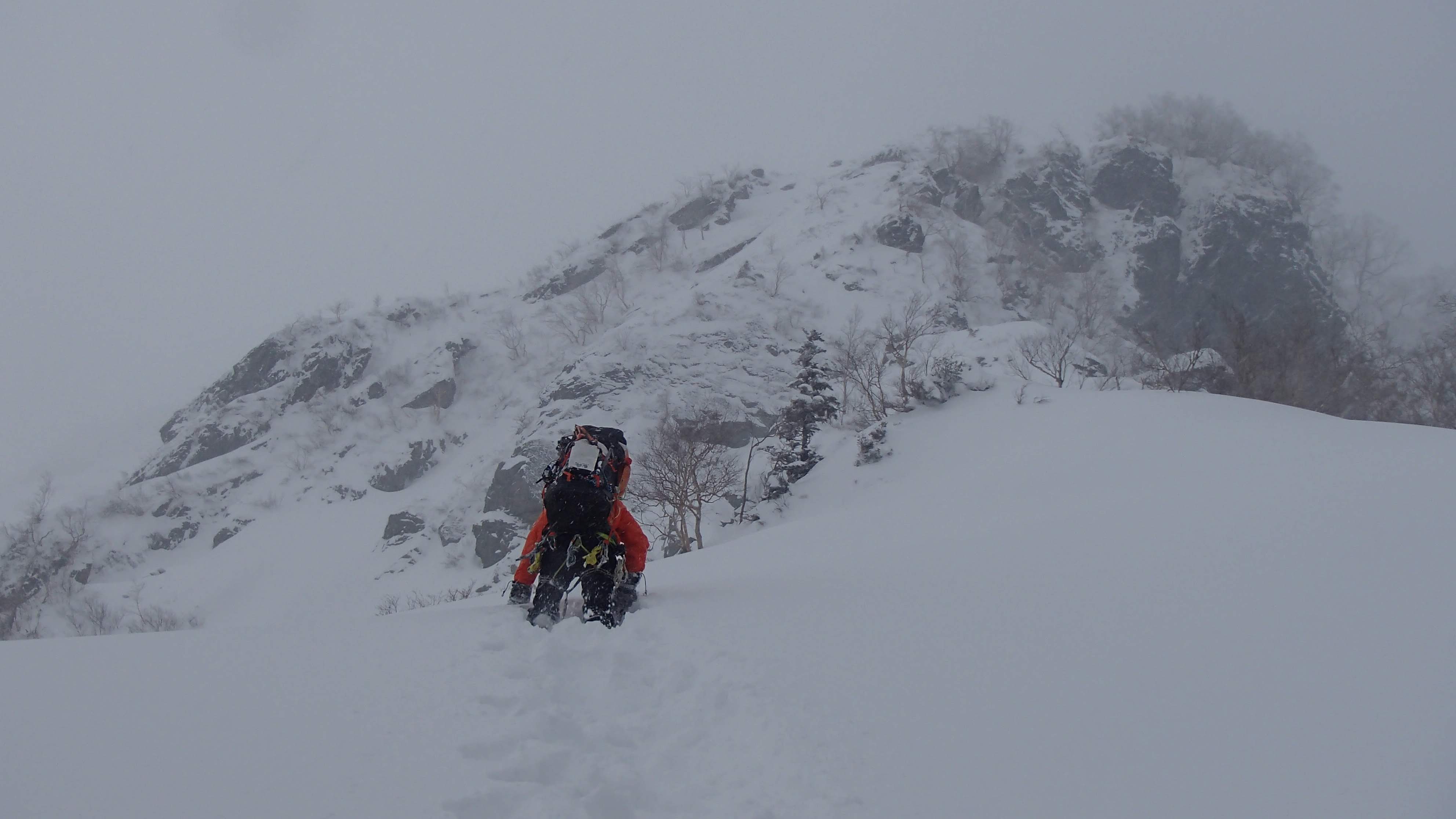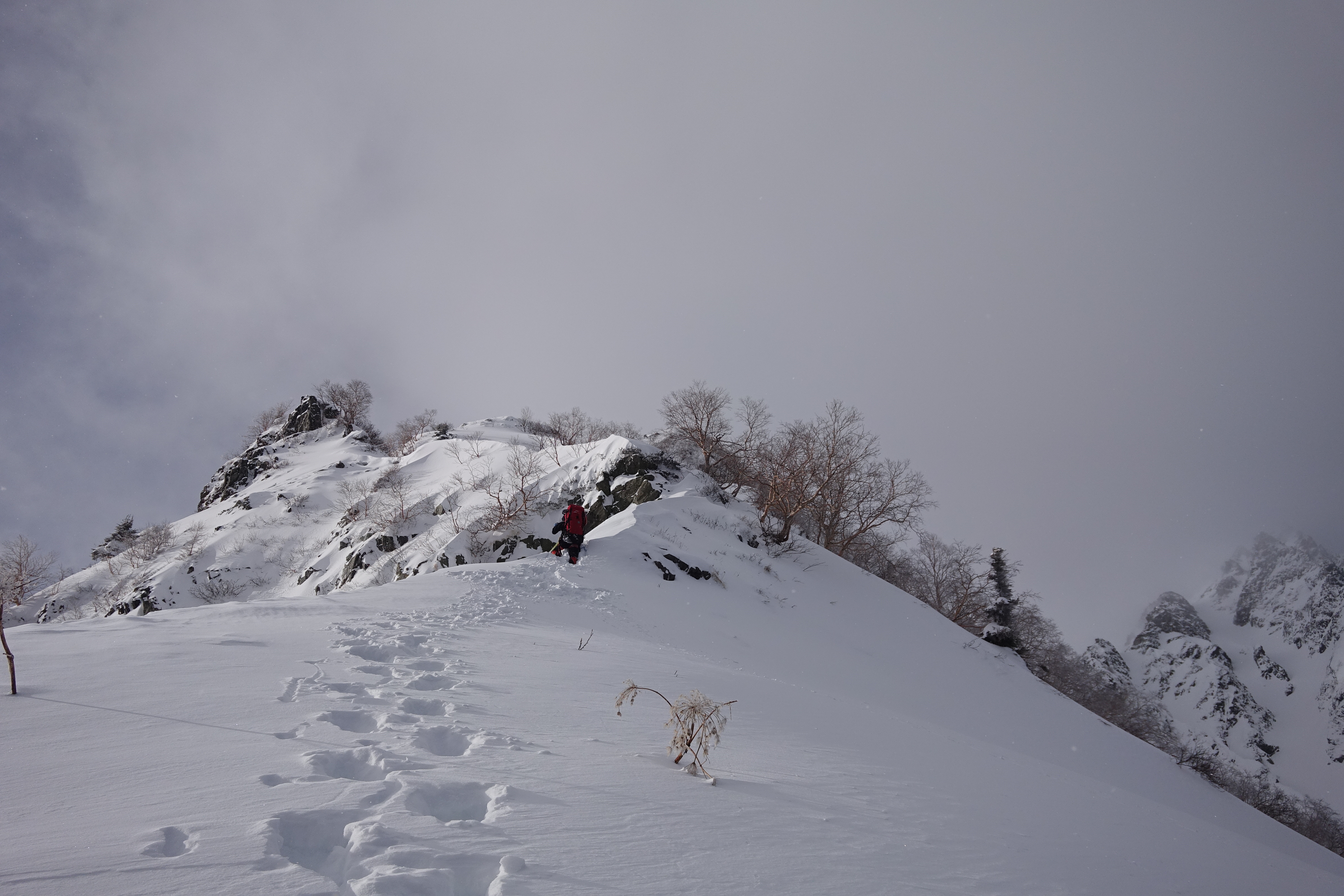 カムの2番が効いたので、あとは残置ピンを駆使してなんとか雪まで這い上がり、しばらく登ったところにある灌木で切る。 あ とは傾斜 が落ちたのでロープはここで畳んで適当に登っていくと目の前にそそり立つ黒い岩山が見えてきて これが明神2峰で、自分がようやく明神1峰間近の稜線にいることがわかる。