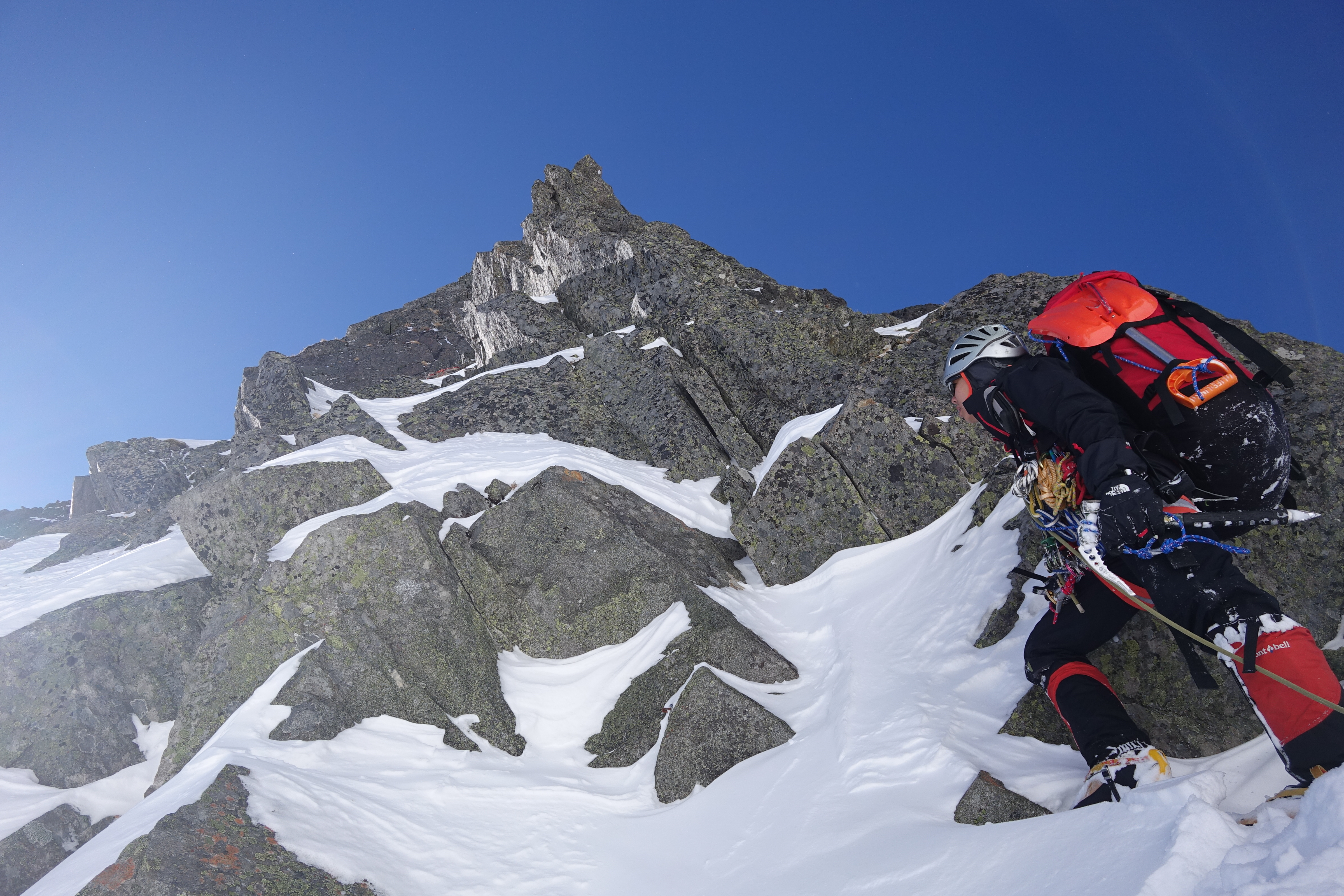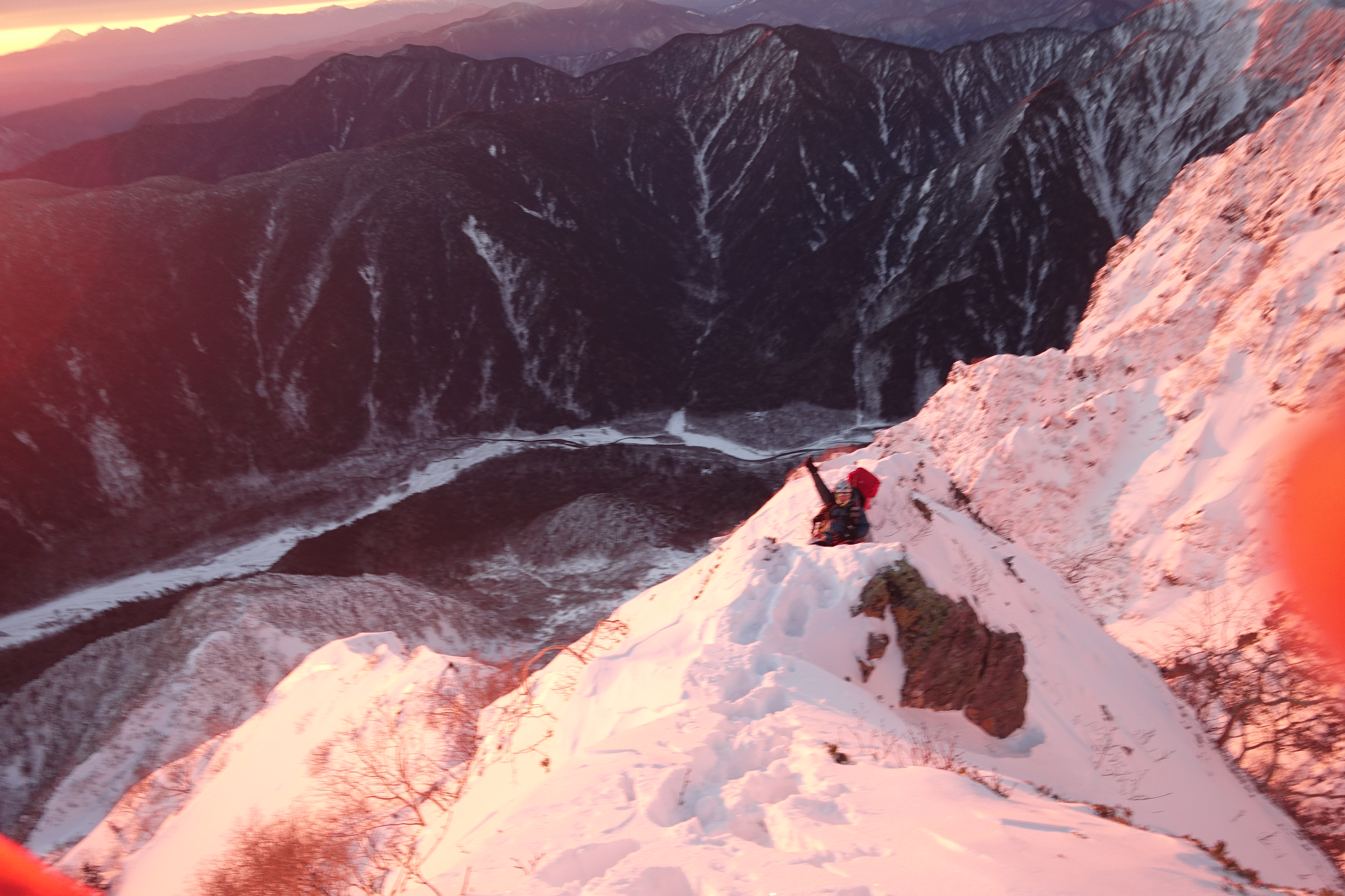 崩さないように、雪や岩にフリクション効かせながら慎重に登っていき残置でプロテクションを取る。 実質的には岩場は10mくらいしか出てなくて右の凹角を登るがバランスが悪く、苦戦しつつもなんとか登る。