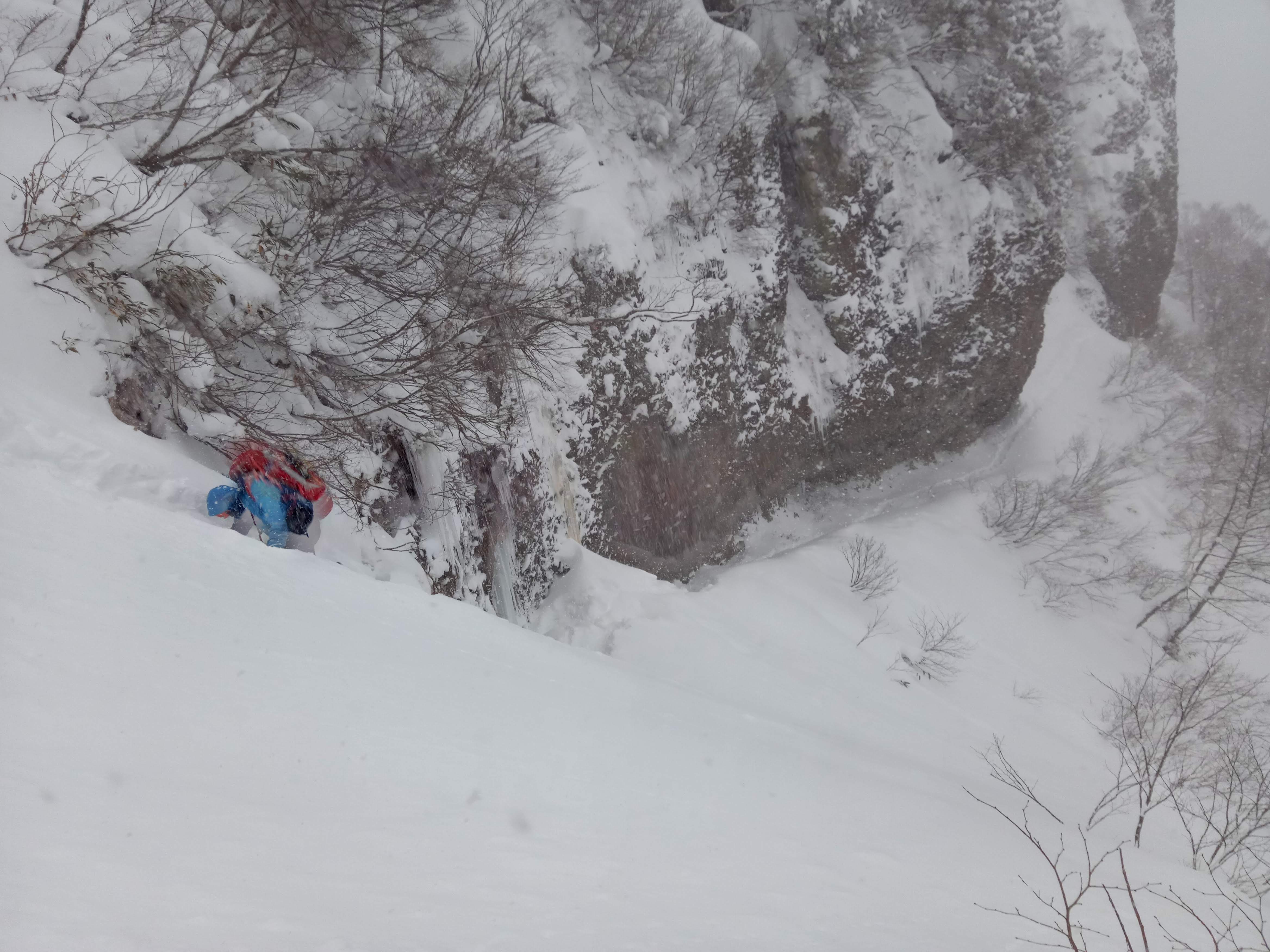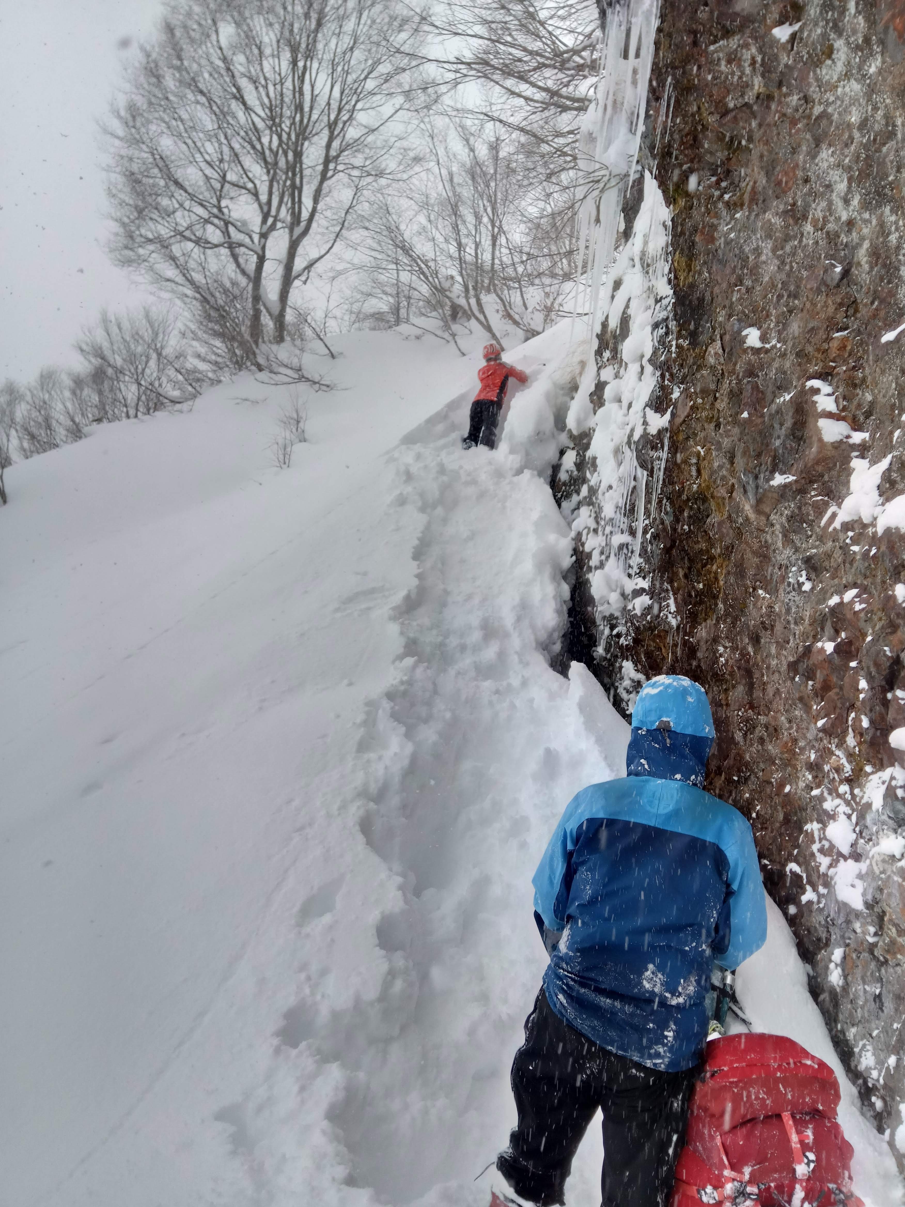 百間長屋付近の岩壁基部トラバースと、その先の雪崩斜面を慎重に通過。