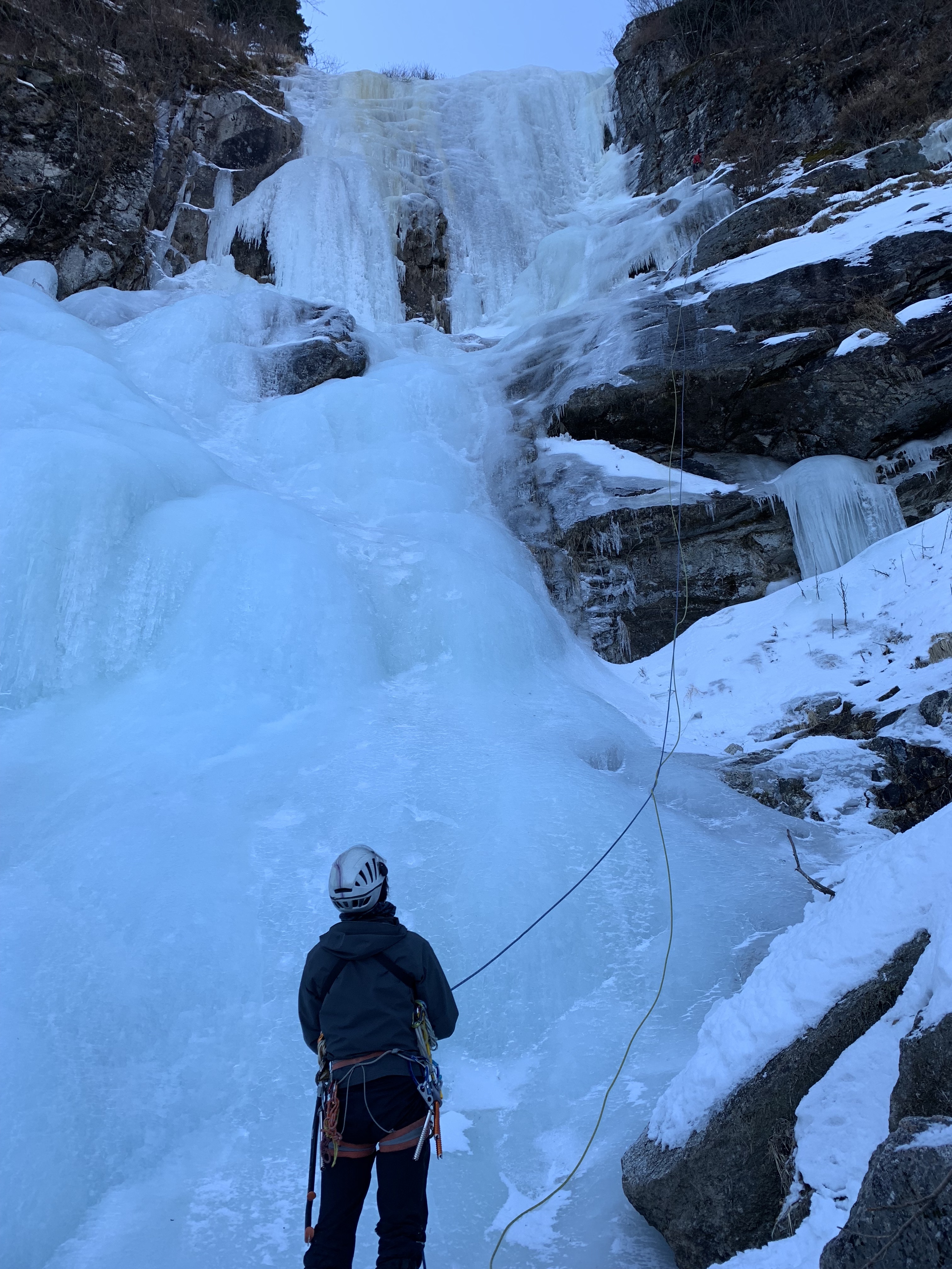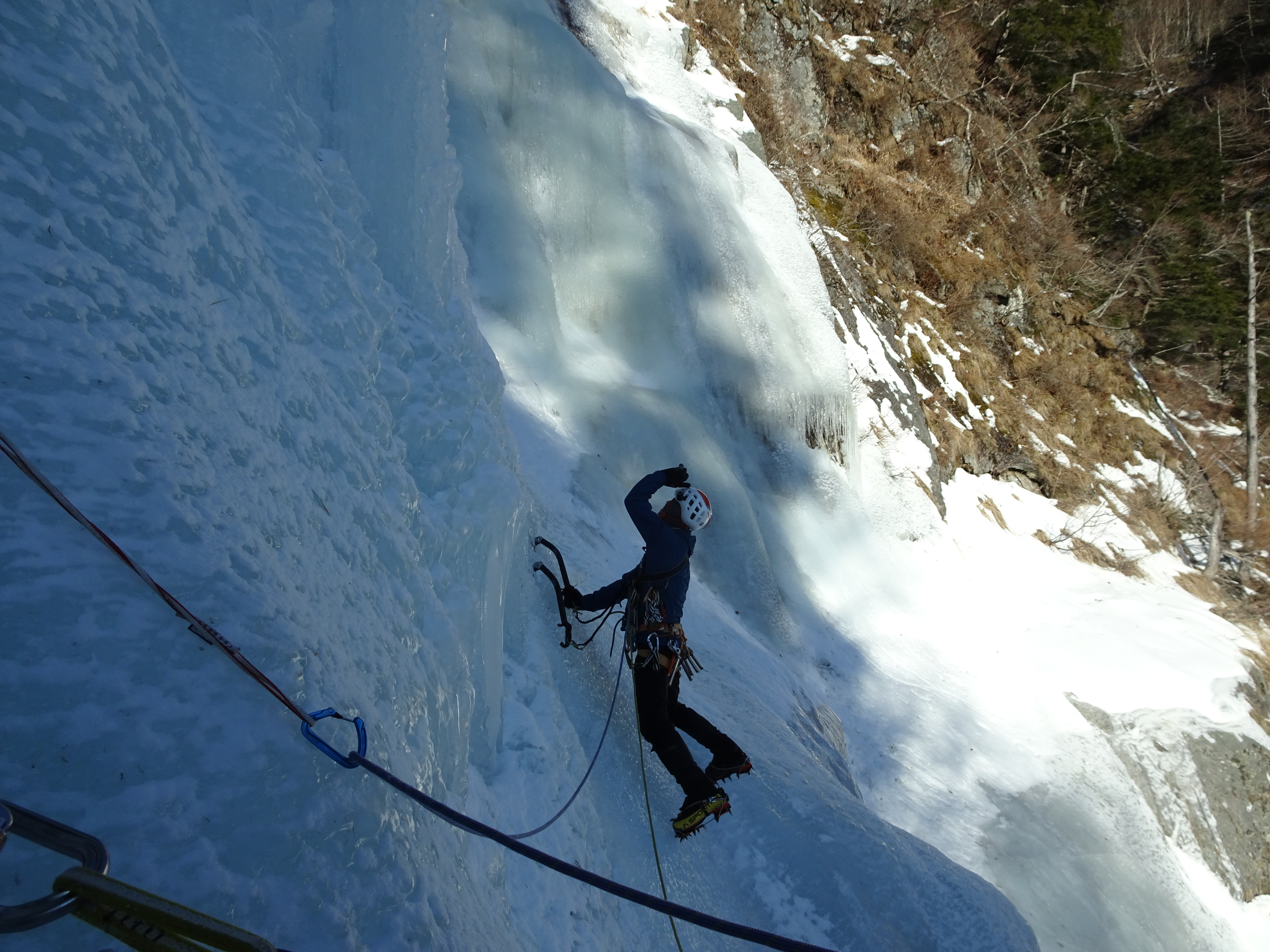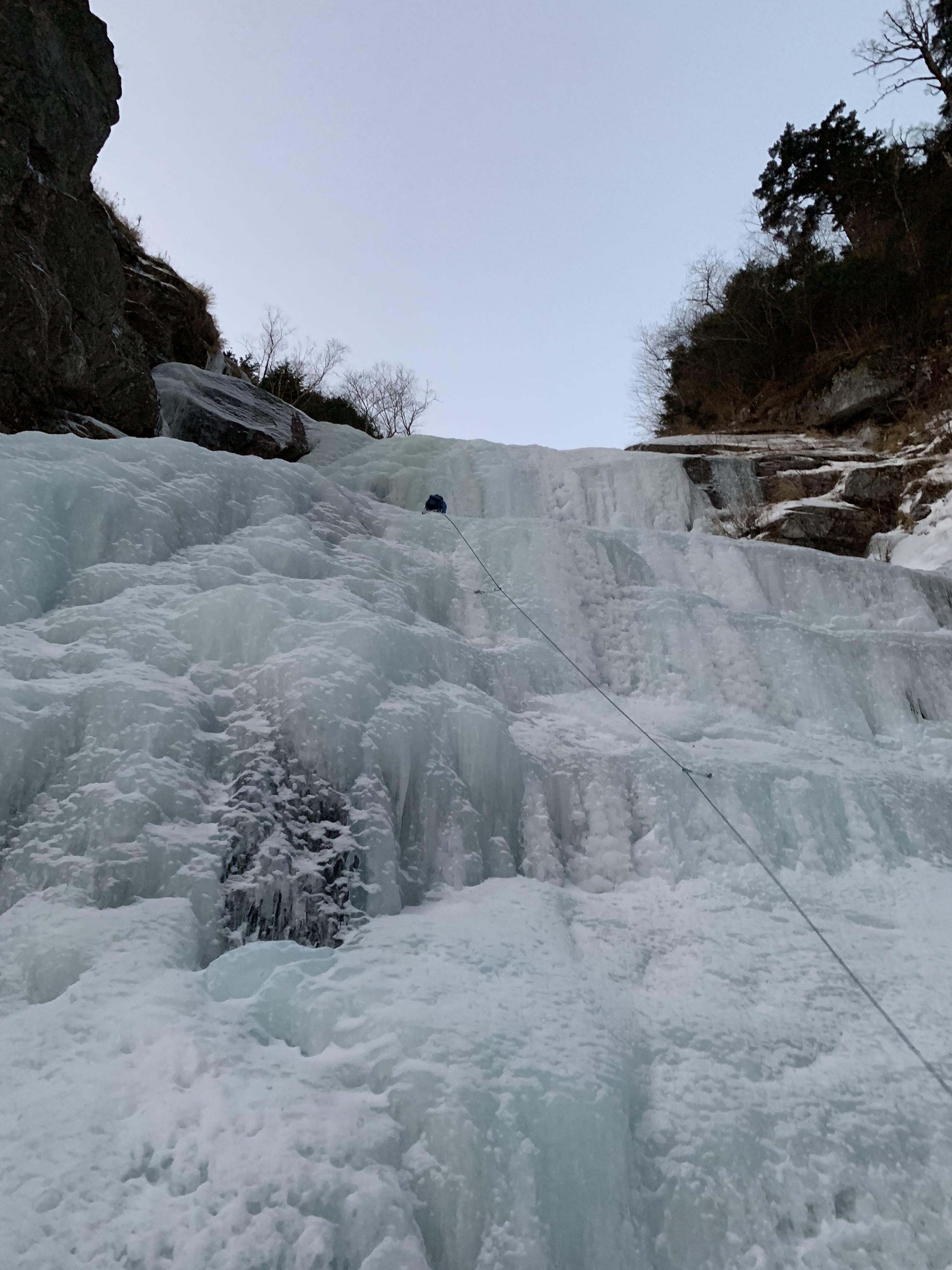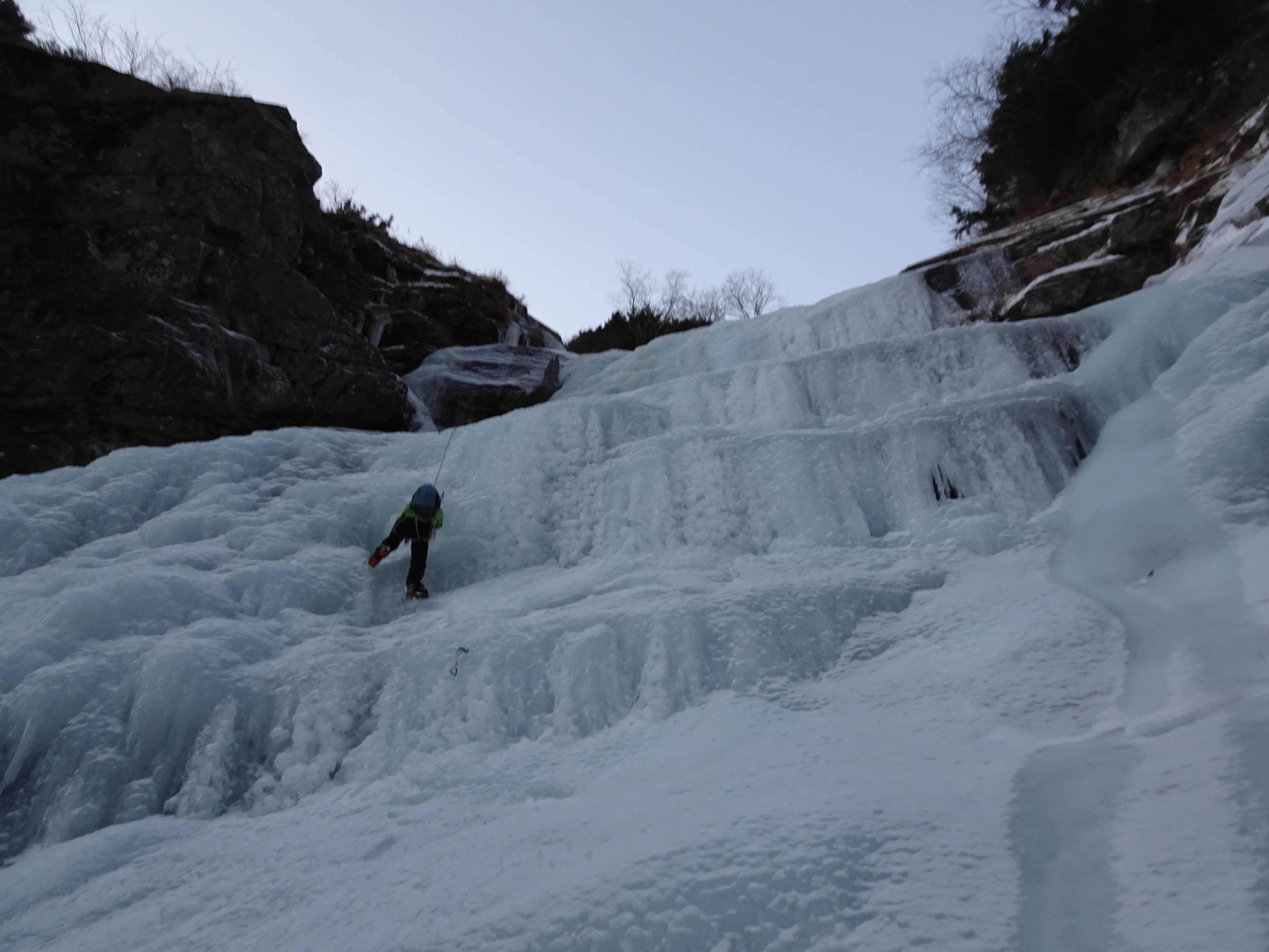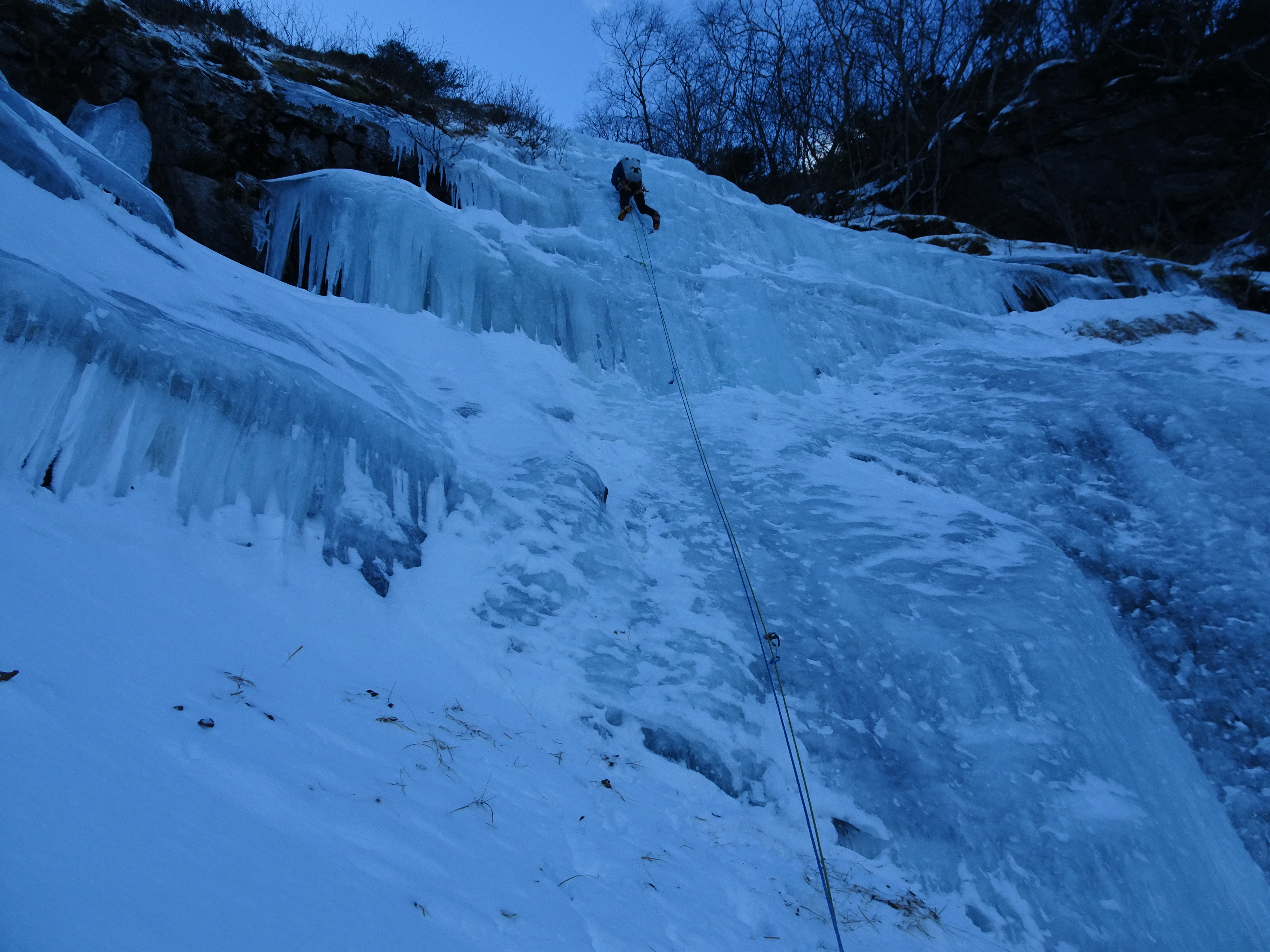 チムニーっぽさは特に無く、易しい氷をさくさく登って灌木でビレイ
