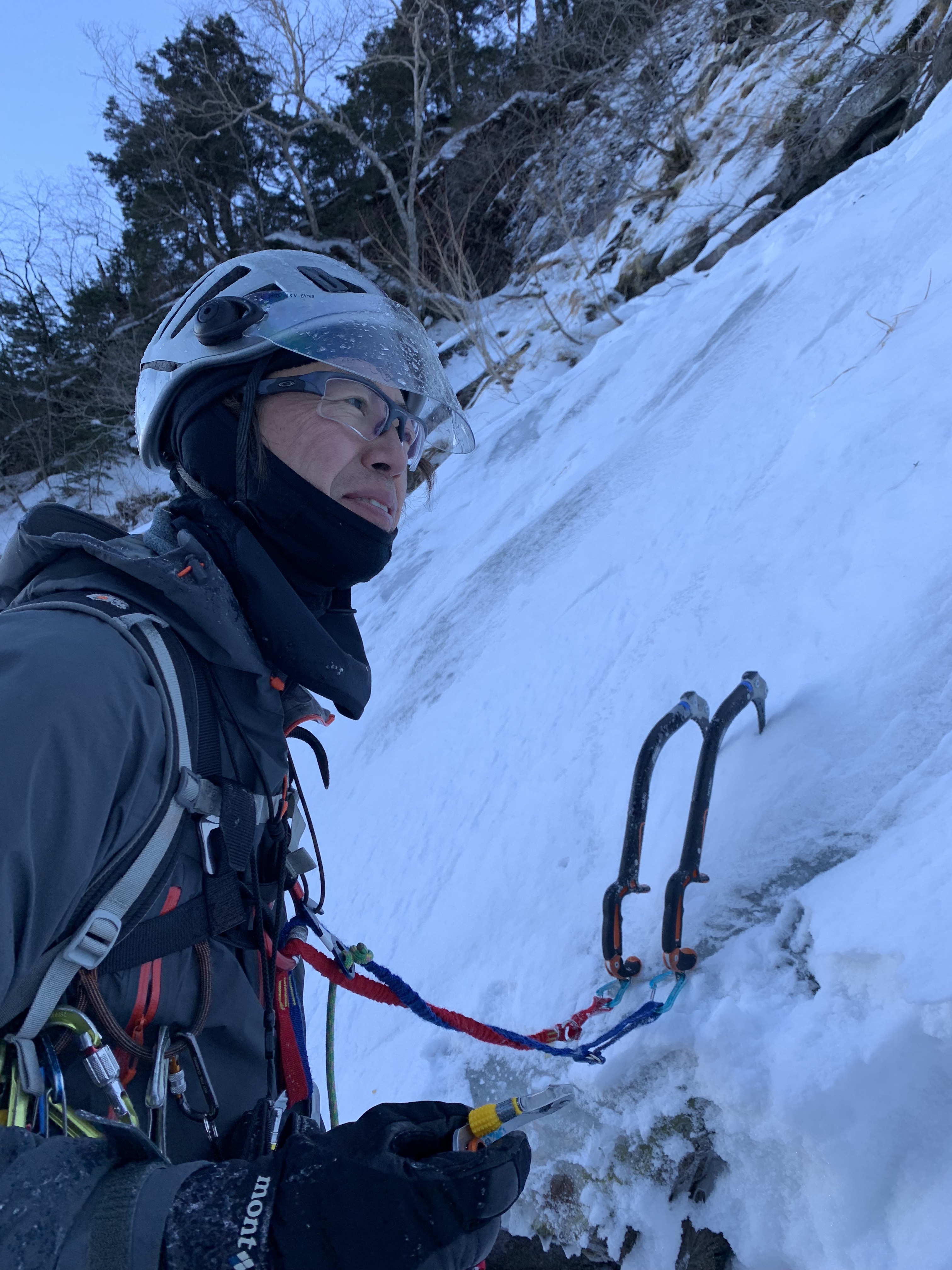 出たしがツララ状で厳しく、安心できる支点も取りづらい。苦しんで登ります。
