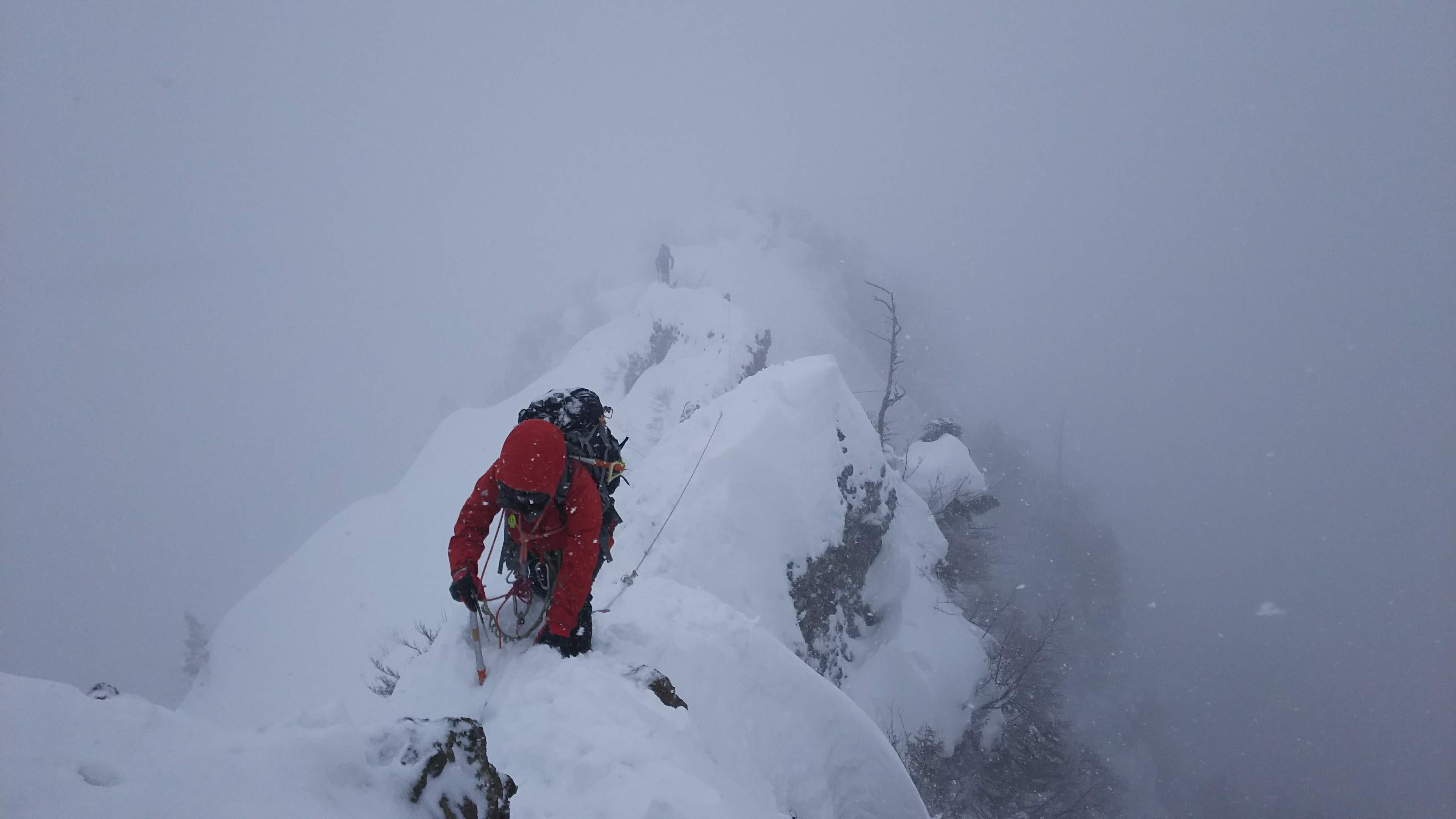 雪庇もしっかり発達していて、踏み抜いたら尾根上に復帰するのが大変そう。