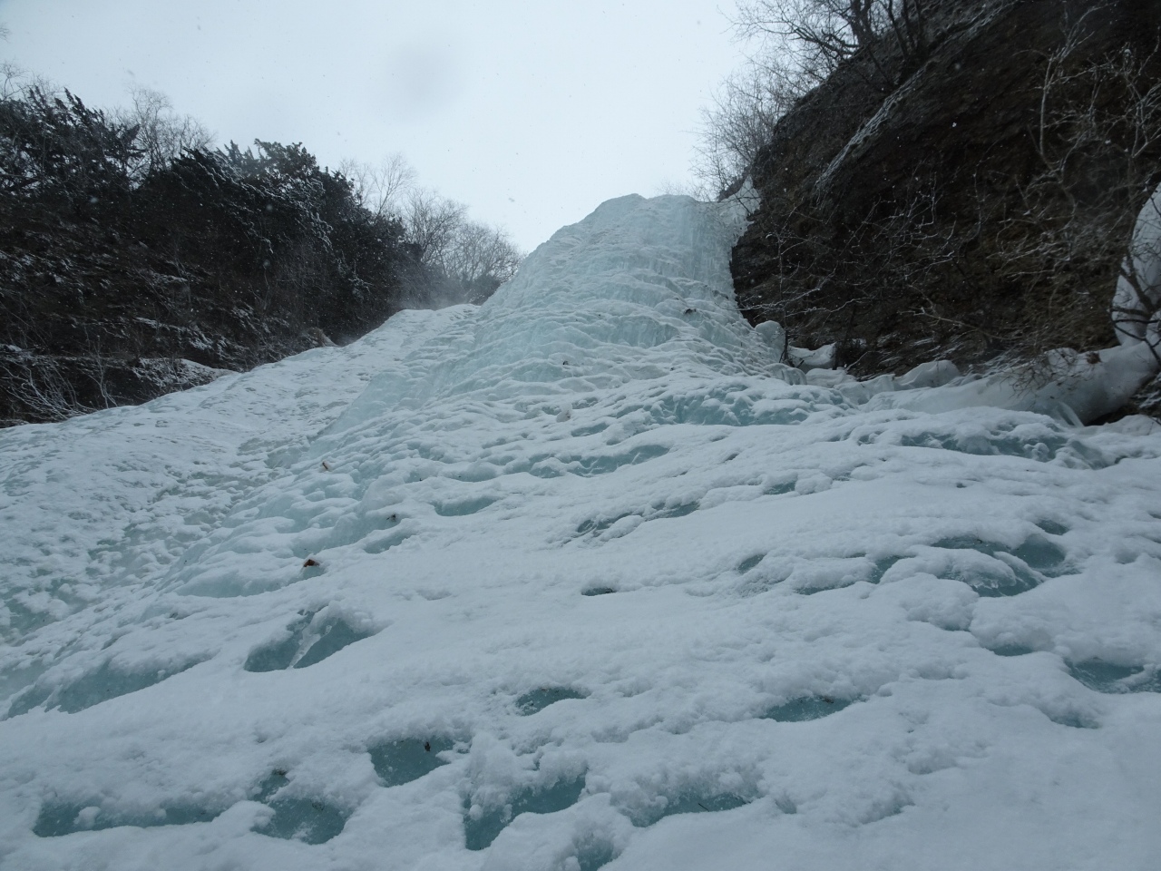 ブルーウルフは幅広で見映えのする大滝で、左岸が垂直部が長く、右岸に行くほど短くなります。