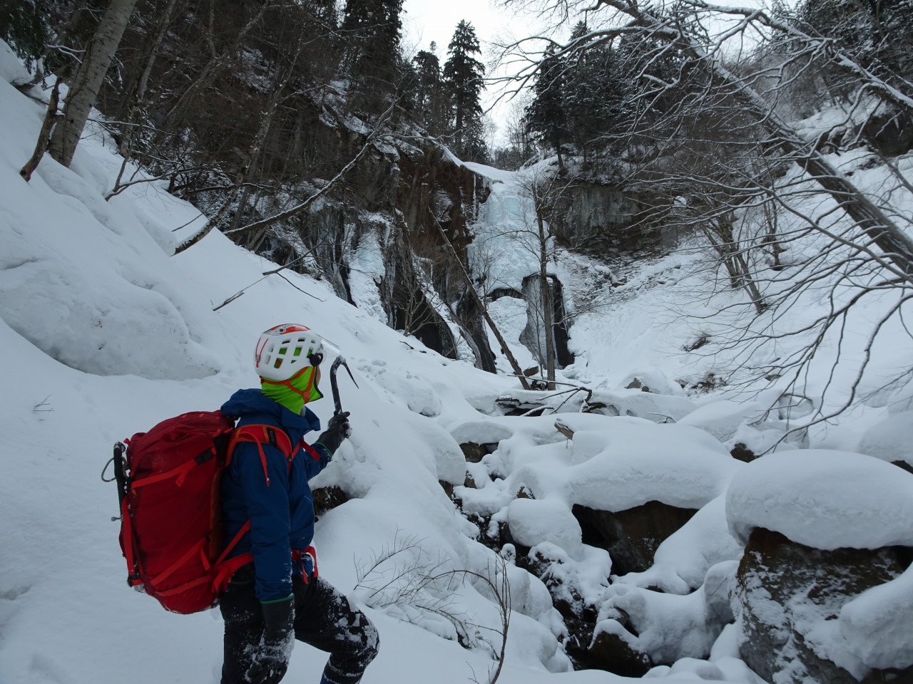 先行パーティが居て、なぜかスコップとプロープを持っていたので、「アイスでは無いんですか」と聞くと、前日にブルーウルフの右岸側を登っていて雪崩を食らったそうで、埋まってしまった荷物の回収に来たとのこと。