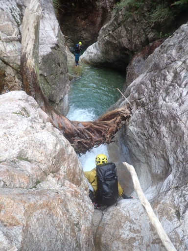 結局、下の大滝、上の大滝ともにロープは2Pだったが、四人での行動、かつ前後の小滝で何度もロープを出していたので、大滝を巻き終わったのは13時半前。
