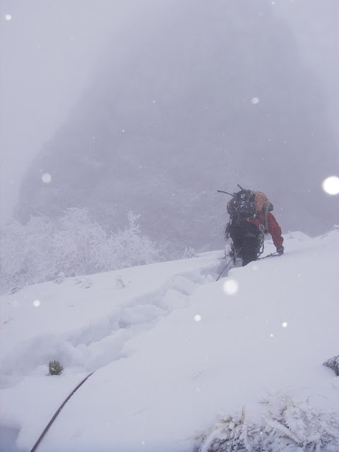 スギ林を越え、2550m地点でロープを出す。岩稜+雪壁で2ピッチ。
