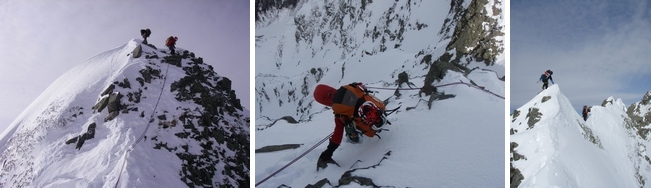 雪崩そうで不気味な狭いルンゼを(S見さん以外は)黙々と登って核心からザイルを出す。全部で5ピッチも出してしまうが、痩せ我慢したら、1ピッチでもよかったかもしれない。