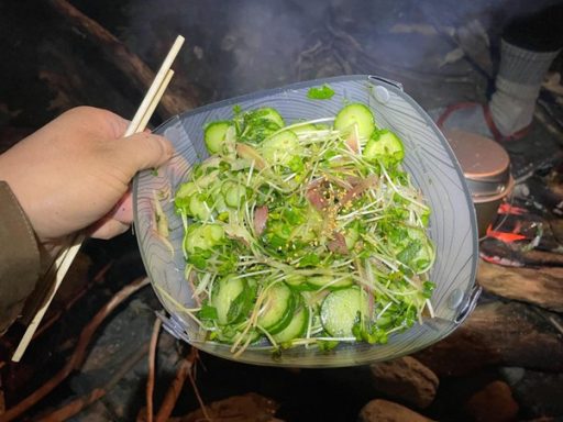 黙々と歩き、ようやく815mで右岸側に幕営ポイントを発見。結構スペースが無いので、M尾さんに藪を開拓していただく。夕飯は前回の反省を活かし、サラダと麻婆茄子を作った。好評で嬉しい。マシュマロやウインナーも美味くてめちゃめちゃ腹いっぱいになった。。。