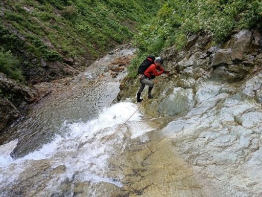 5:30行動開始。少し歩くと、3mの2連の滝。ここは右から巻く。その先は10mCS滝。この遡行の核心部と言えるだろう。一度近くまで様子を見るが、ここも当然巻く。少し引き返して、ルンゼを登り、右から大高巻きした。ルンゼではロープを出してもらう。巻きは少し藪っぽく慣れていない自分は見失いそうになるM尾さんを一生懸命追いかける。その後、6mのナメ滝。左からトラバース気味に登るラインを見出し、M尾さん、I橋さんと登り、その後に私。お助けのロープを出していただいた。地味に初めてのハーケン回収も行った。