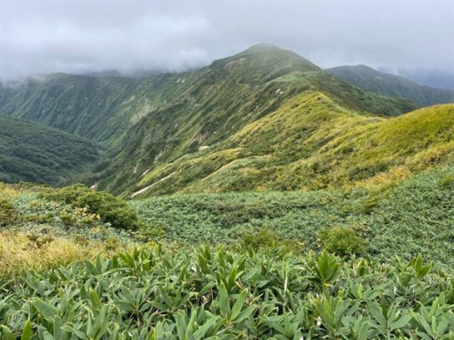 そうすると1050mの沢の分岐。右を選択し、ここからは稜線までの詰め上げだ。次第に水流が途絶え、藪を漕がずに稜線まで行けるのかなーと思ったら、ほんとに終盤で少しだけ藪があった。 稜線に出るとびっくりするくらい歩きやすい。和賀岳までのビクトリーロードを歩き、頂上へ。先客の方が数名いらっしゃった。少しガスってるが、山深くて最高の気分。ここまで来てよかったなあと思った。(運転していないのに、スミマセン…)