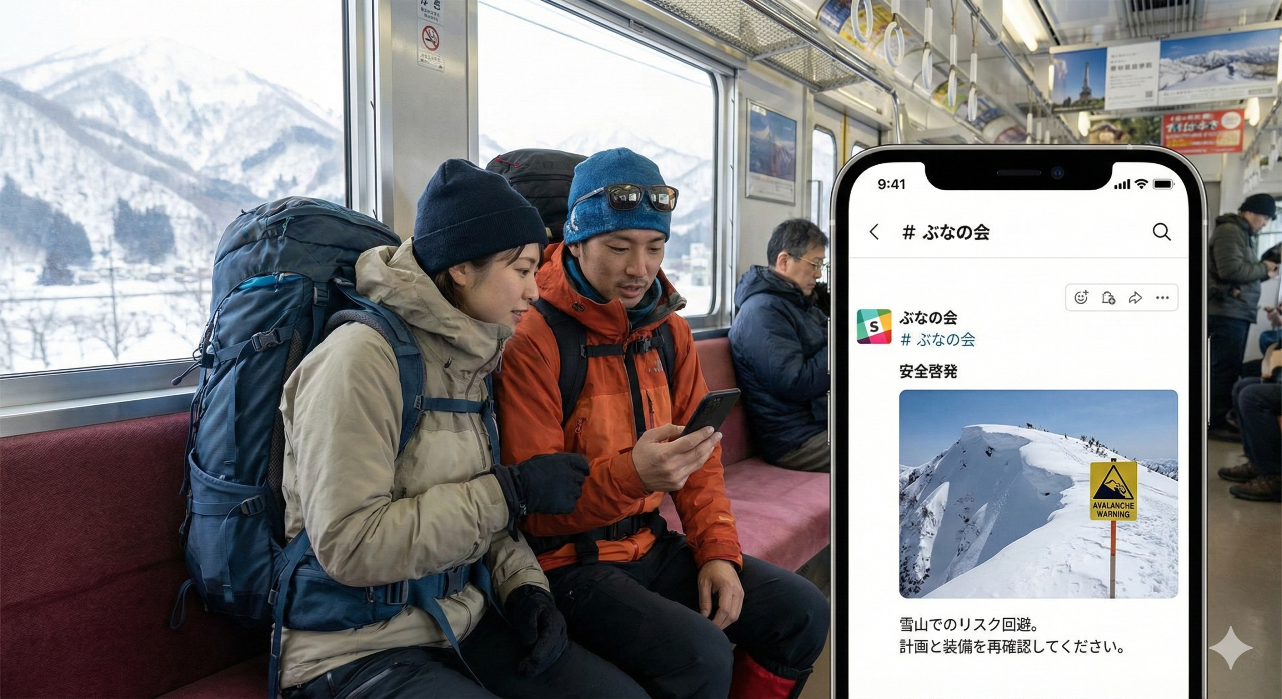 Slackによるクイックな共有が極めて有効なのは、何よりもその「即時性」と「手軽さ」にあります。移動中の電車内や、まさにこれから山へ入ろうとする登山口など、本格的な報告書を読み込む余裕がない場面でも、スマートフォン一つで重要なエッセンスを短時間で確認できるからです。入山直前の数分間で、AIが整理したリスク要因や図解を直感的に把握できる仕組みを整えることで、より実効性の高い注意喚起が可能となりました。