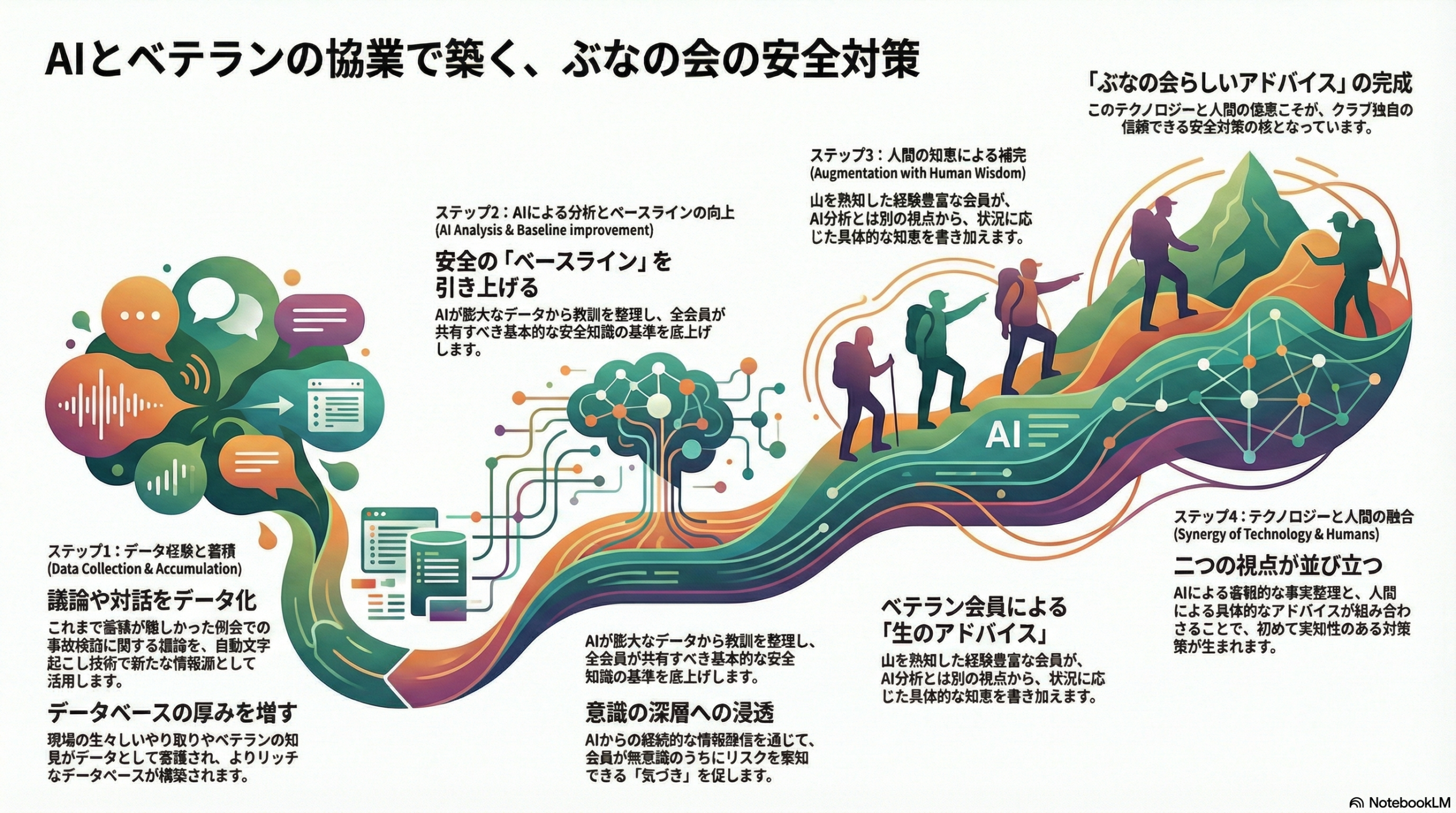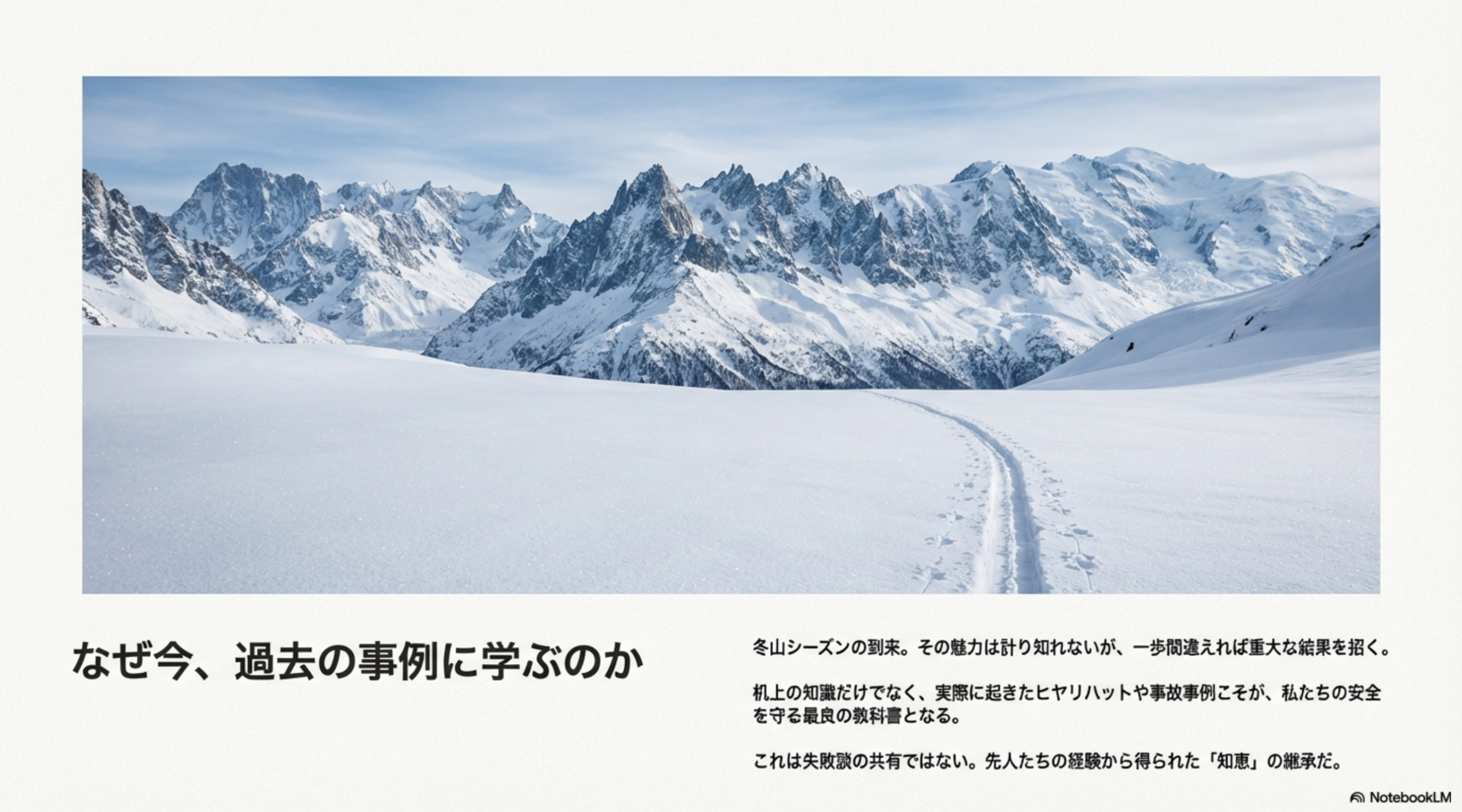 - 外部知見との統合: 私たちは会内の記録だけに閉じこもることはありません。公的機関や他団体から発信される最新の遭難事例や気象統計など、有益な外部情報も積極的に取り込み、NotebookLMを通じて解析・統合しています。