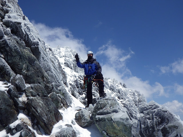 我々がリッジとその手前の下降の2ピッチロープを出しているうちに、追い抜いていったガイドパーティが帰ってきた。頂上直下のカニのハサミのルンゼでは、スリップしたら数百m滑のおそれ有とのリーダー判断でロープを出す。その間に、更に数パーティーに追い抜かれる。