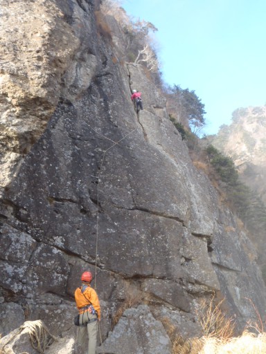 それぞれ数本登った後、午後2時から右に移動してクライミングの練習。T塚・T尾が草溝ルート(Ⅳ級)A見・N島が地蔵左(Ⅴ-級)をアルパインスタイルで登る。自分はフォローで登ったが、ハーフロープ2本で登ったのは初めてだったので、ロープの結び方からクリップの仕方まで勉強になった。ルートの方は、「プロテクションがハーケンだから落ちられない~」と緊張しつつ、一番上の部分がレイバックを入れて登るなど、なかなか楽しい岩だった。アイトレも必要だけど、普通のクライミングのトレーニングとして、来シーズンは是非再訪してみたい。