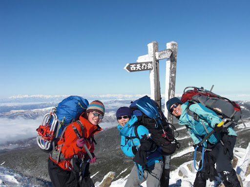 このあたりから、何Pかと遭遇。中山付近では小屋どまりで天狗に登りに来ている人が大勢いた。高見石付近で天国のような幕営地を発見したので、ここに野外テーブル付き御殿を設営して宴会開始。真っ白な雪の中、ぽかぽか日和で最高のキャンプとなった。