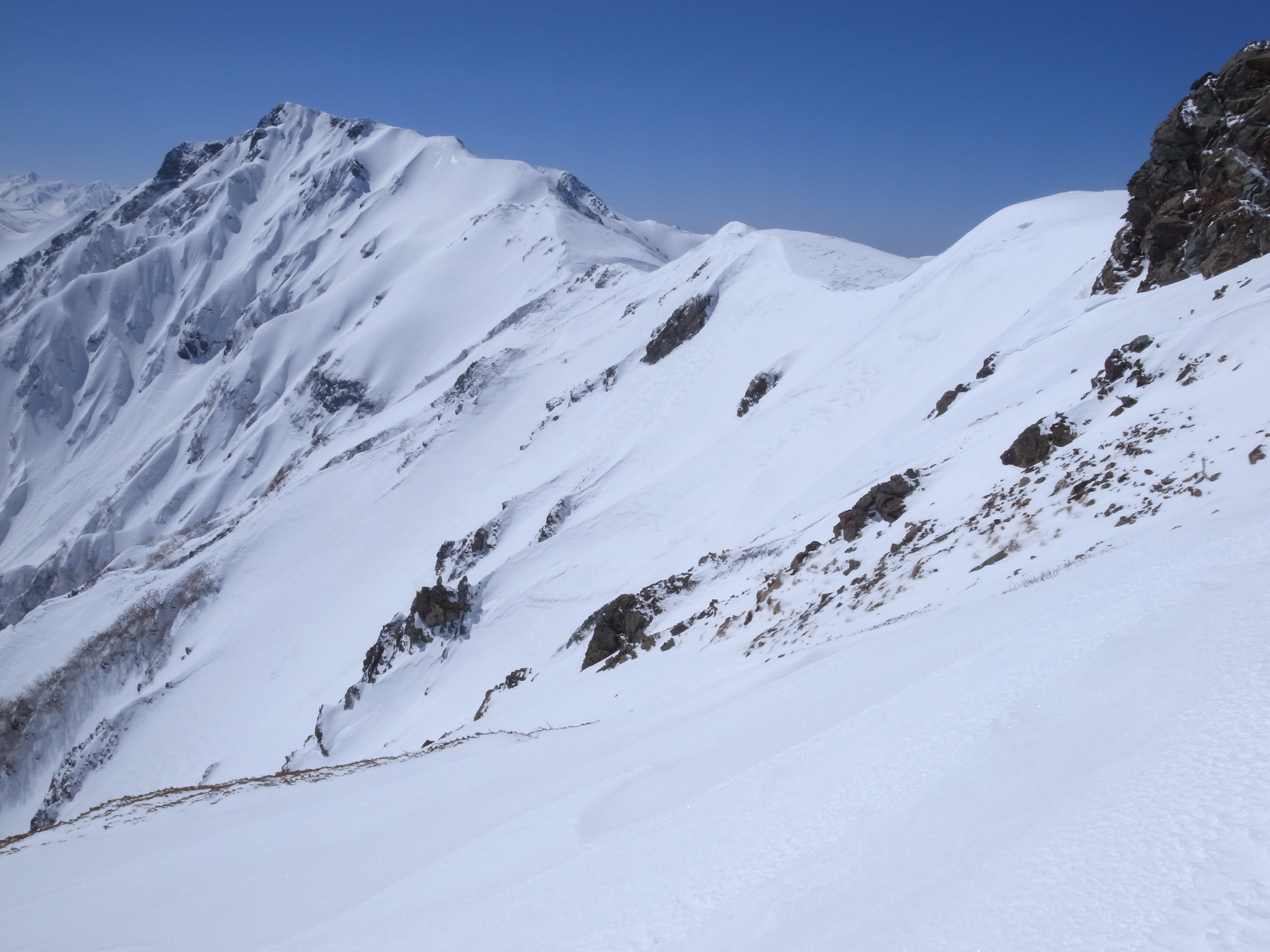 S山さんも書かれていましたが、標高の高い所のクラスト、稜線では雪庇に引かれ亀裂が多数、春ですね。