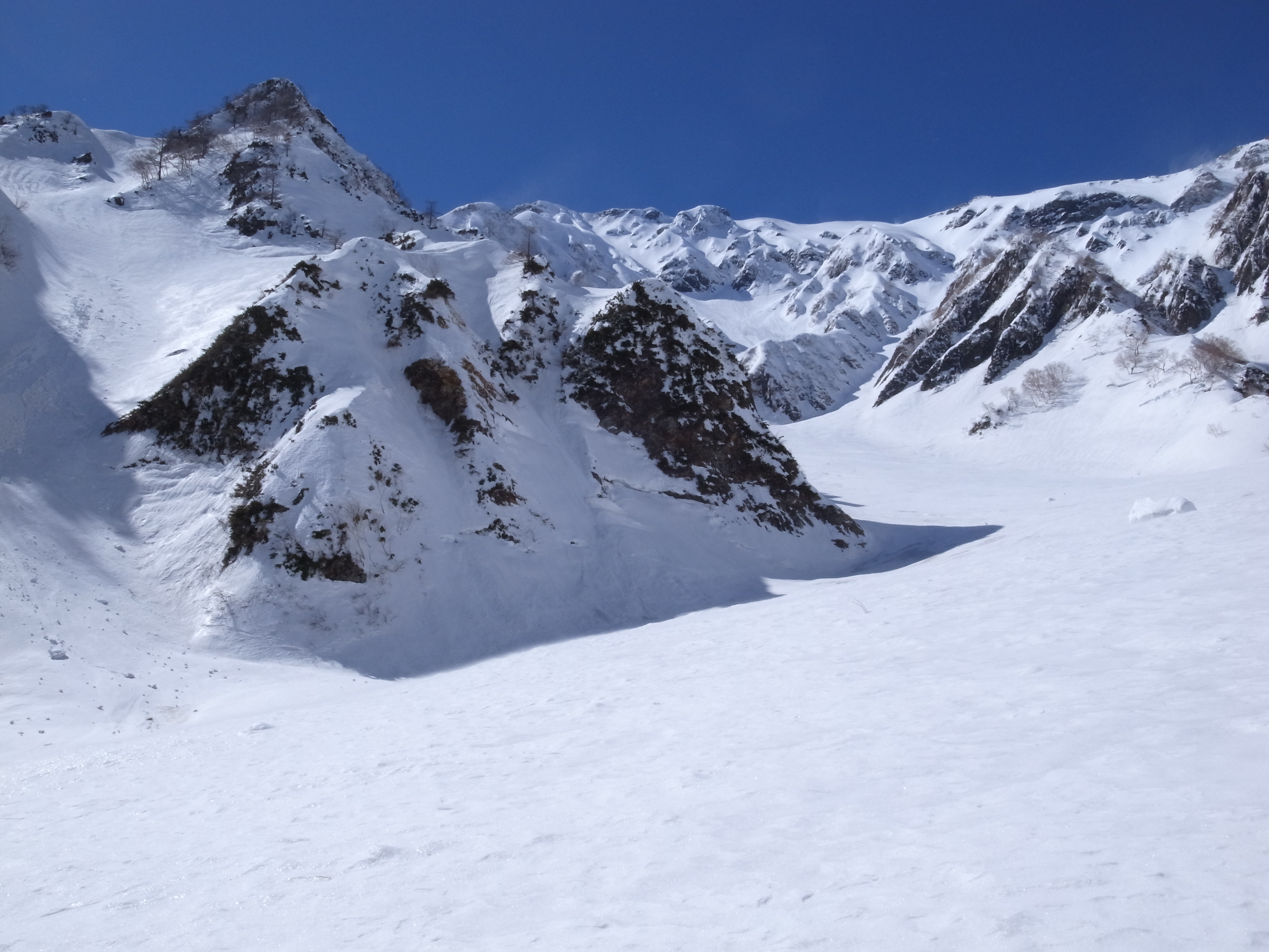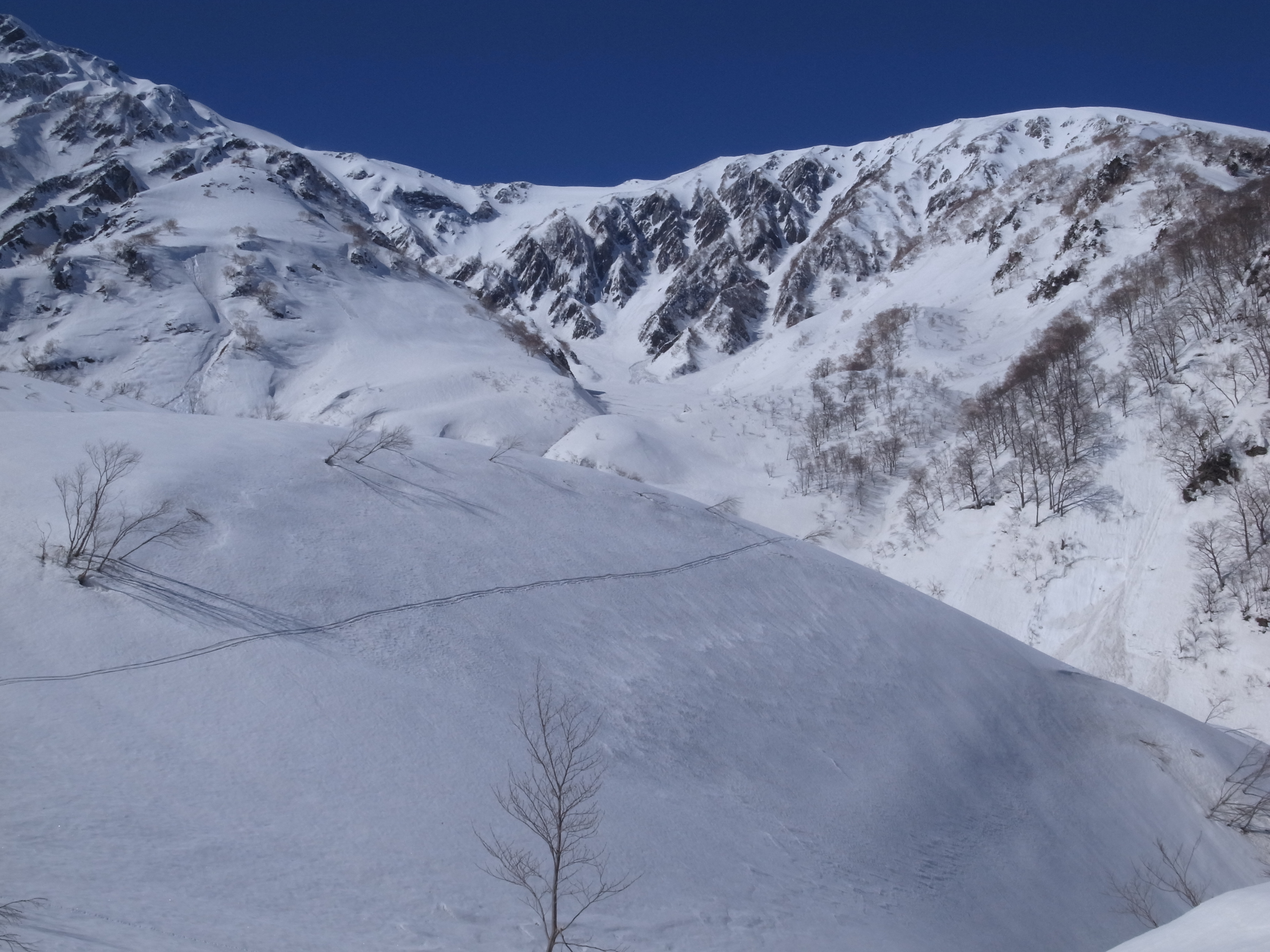 南面なのでいくらか柔らかいか。傾斜45~40°の比較的広い谷が白馬沢のボトムまでずっと続く。