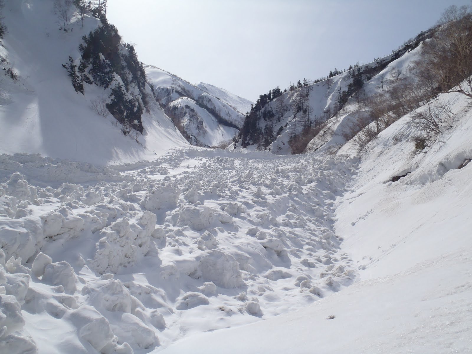 ‘喉’の下と思われる個所(約2400m)で本流と合流後は、雪の柔らかくなった緩斜面を快適に滑る。右岸に針ノ木峠からの沢が出合ってからは、だんだんと両岸からの巨大デブリも増えてくる。適当に左岸右岸とスノーブリッジで渡るのを繰り返すと、平の渡に到着した。
